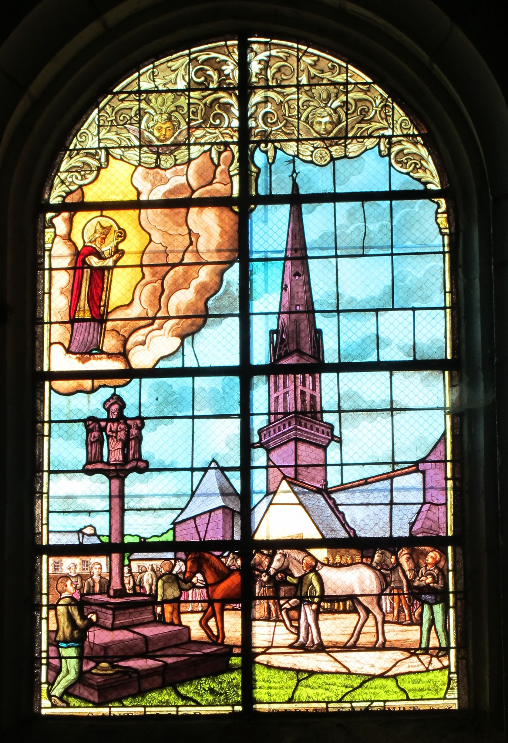 Vitrail, Saint-Eloi bénissant les chevaux le jour du pardon. Atelier Saluden, 1929.Immatriculation