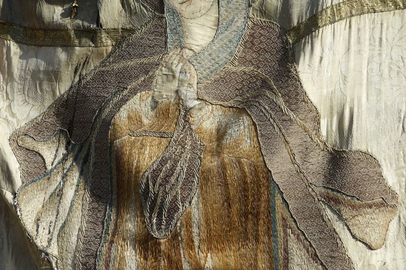 Ensemble de 2 bannières de procession : Christ en croix ; Immaculée Conception ; Sacré Coeur (Rimou),