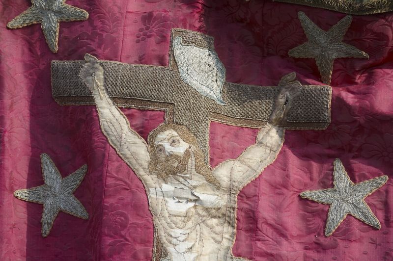 Ensemble de 2 bannières de procession : Christ en croix ; Immaculée Conception ; Sacré Coeur (Rimou),