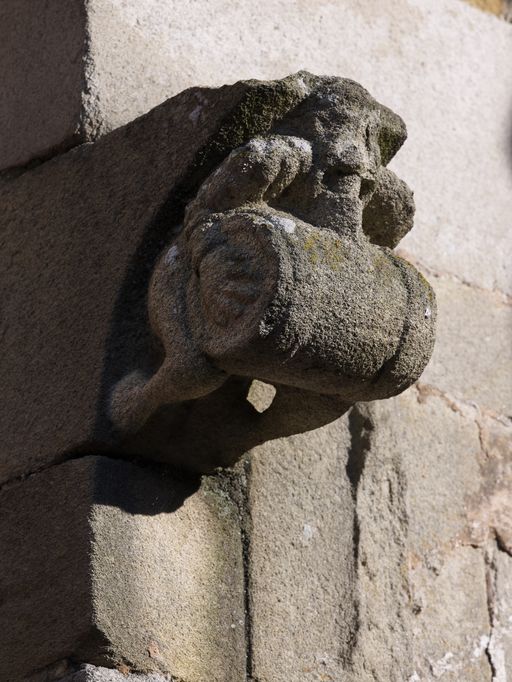 Nef, élévation sud, 4e contrefort à partir de l'ouest, modillon : l'homme porte un tonneau et représente l'ivrognerie (état en 2012)Immatriculation