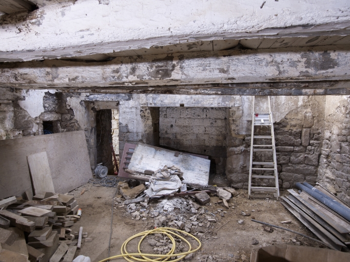 Logis est, salle devenue étable, vue vers l'ouest : cheminée, porte de communication avec le logis à étage, armoire muraleImmatriculation