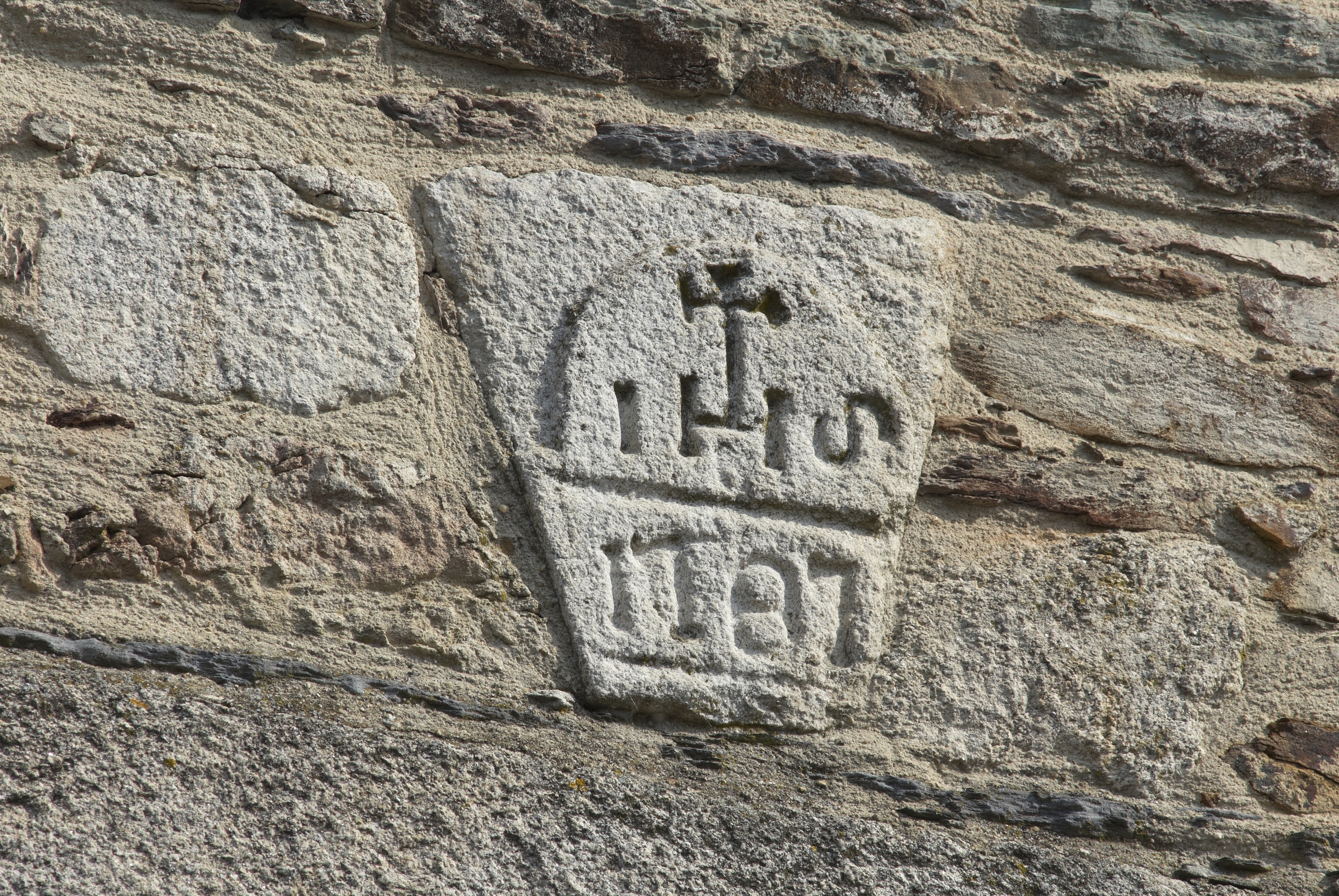Maison, 28 rue de Gaulle, au-dessus du linteau de la fenêtre du 1er étage : pierre gravée de l'inscription IHS et de la date 1787 (état en 2011)Immatriculation