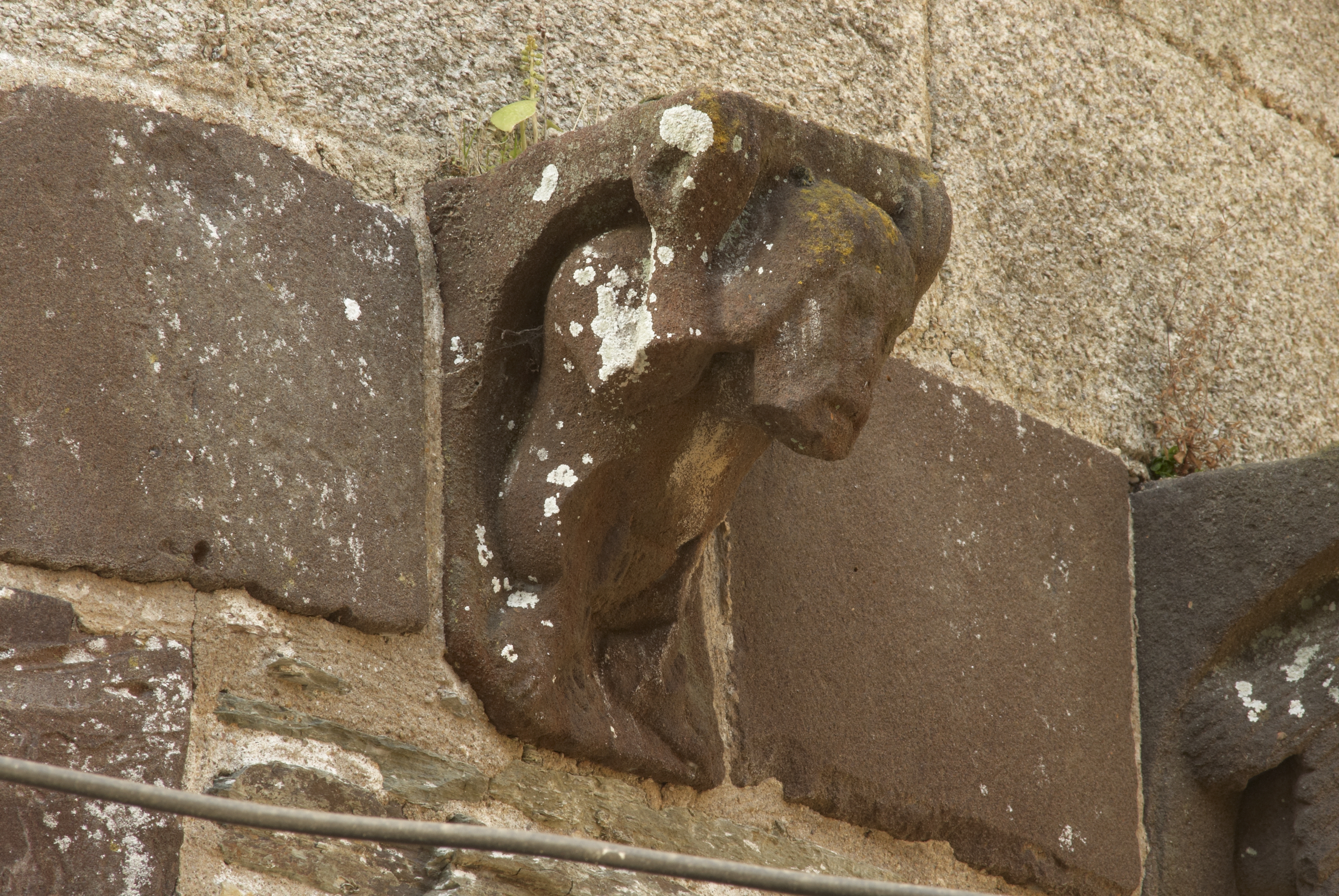 Bras sud du transept, modillon en grès rouge remonté au chevet de l'absidiole : homme accroupi supportant un poids sur son dos, 12e siècle (état en 2012)Immatriculation