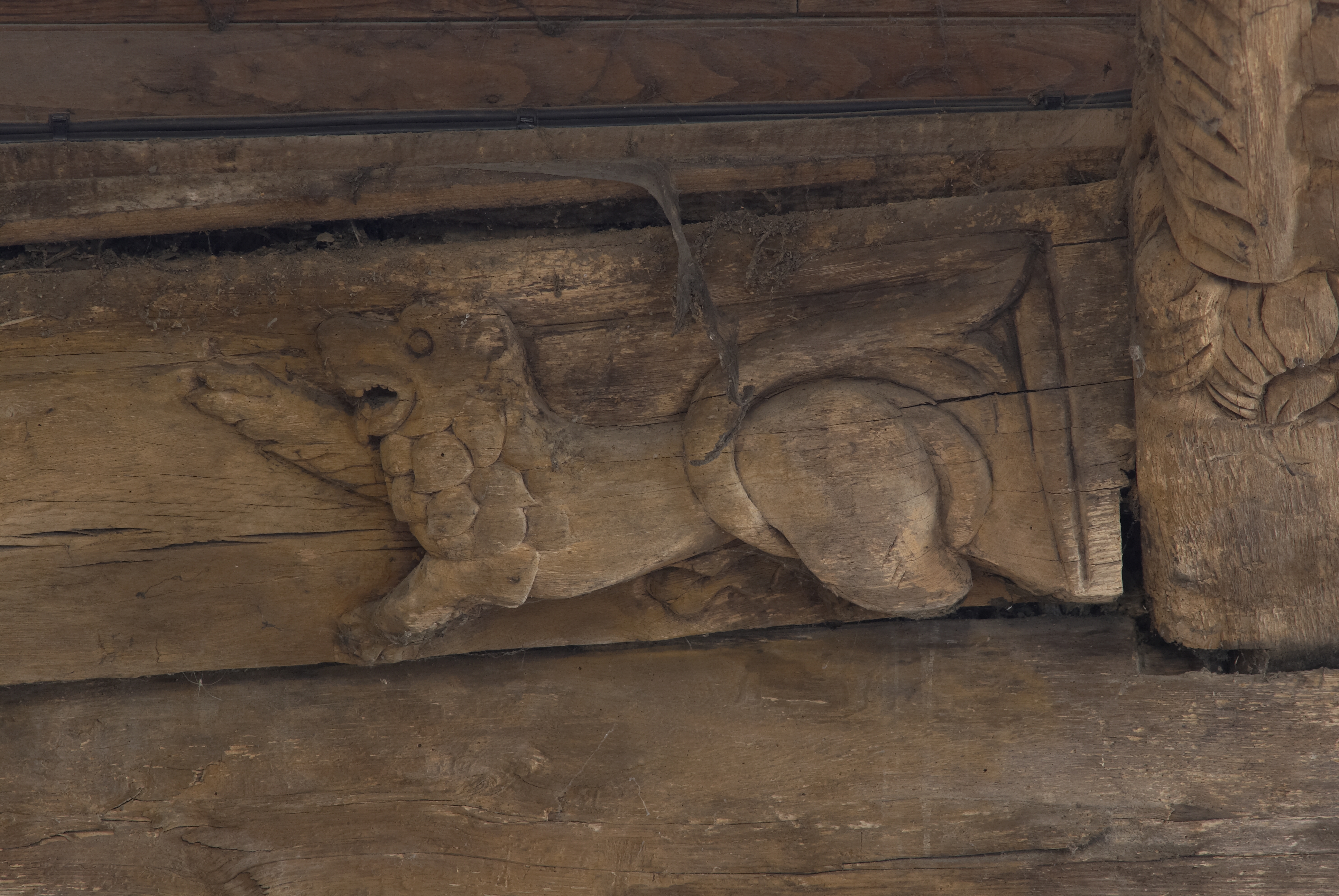 Nef, mur sud, sablière : un lion ailé (état en 2012)Immatriculation