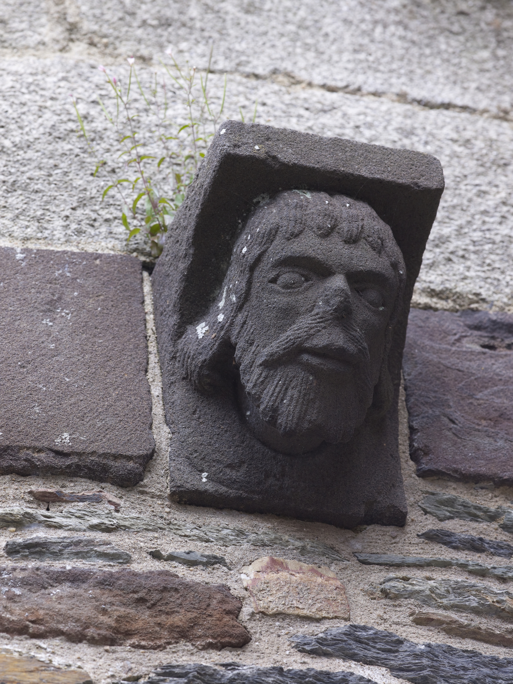 Bras sud du transept, modillon en grès rouge remonté au chevet de l'absidiole : tête d'homme, 12e siècle (état en 2012)Immatriculation