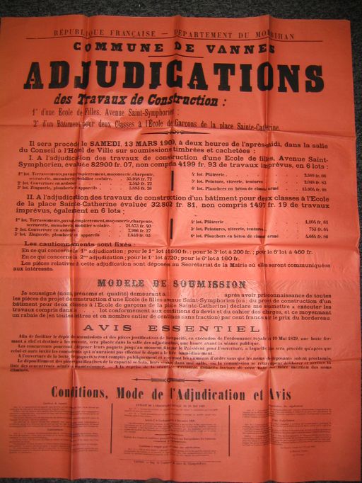 Affiche d'adjudication des travaux, 1913. AD Morbihan 2O260/13.Immatriculation