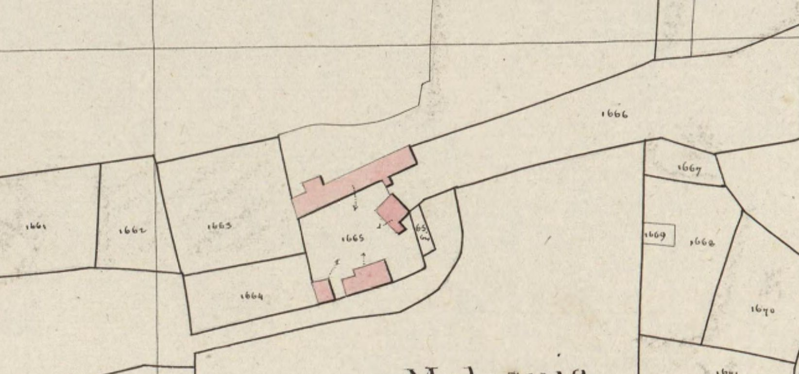 Les Fougerêts. Cadastre napoléonien, section E2 du bourg. Levée par M. Thébaut, géomètre, 1824, échelle 1:2500.
