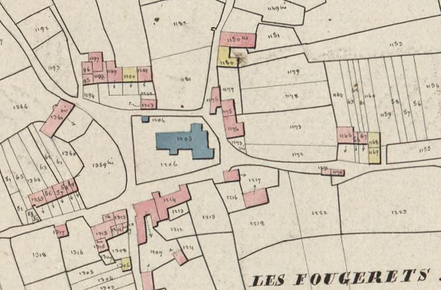 Les Fougerêts. Cadastre napoléonien, section E1 du bourg. Levée par M. Thébaut, géomètre, 1824, échelle 1:2500.