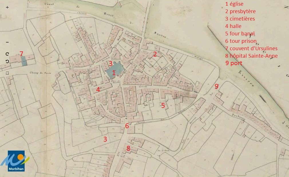 Malestroit. Cadastre napoléonien, section B2 de la Ville. Levée par M. Louaisel-Dupaty, géomètre du cadastre, 1829, échelle 1:2500 e.
