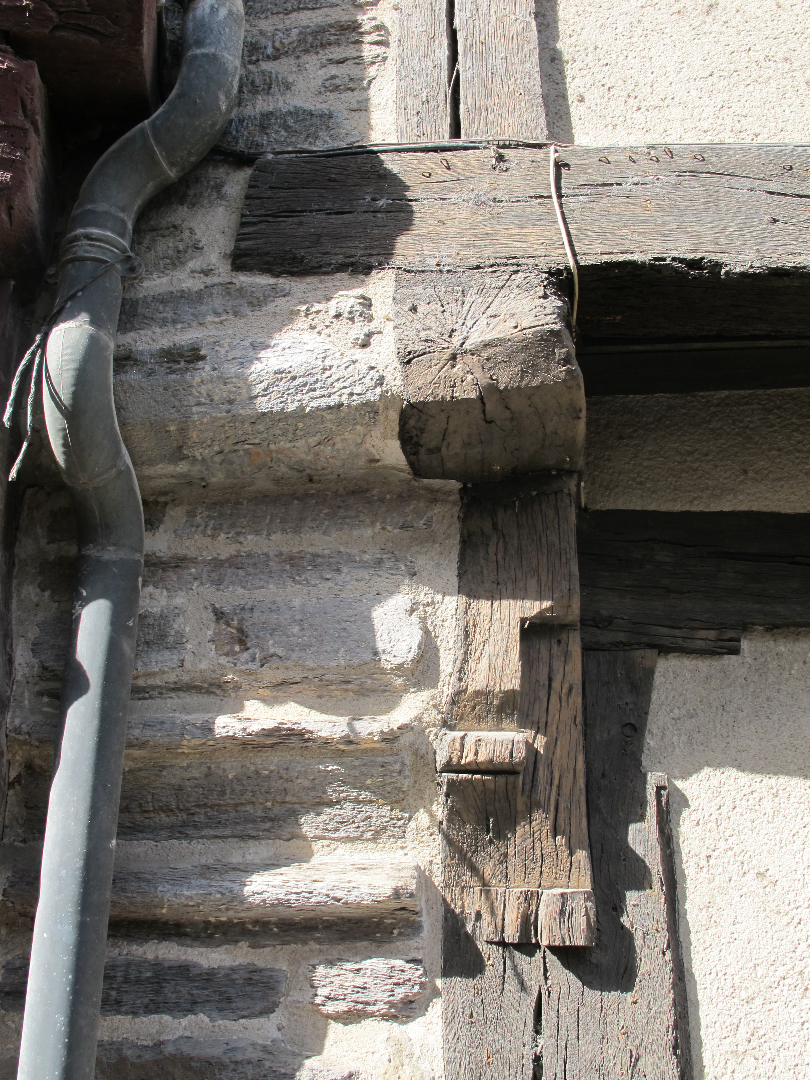 Maison : détail de l'assemblage des poteaux et des sablières (état en 2012)Immatriculation