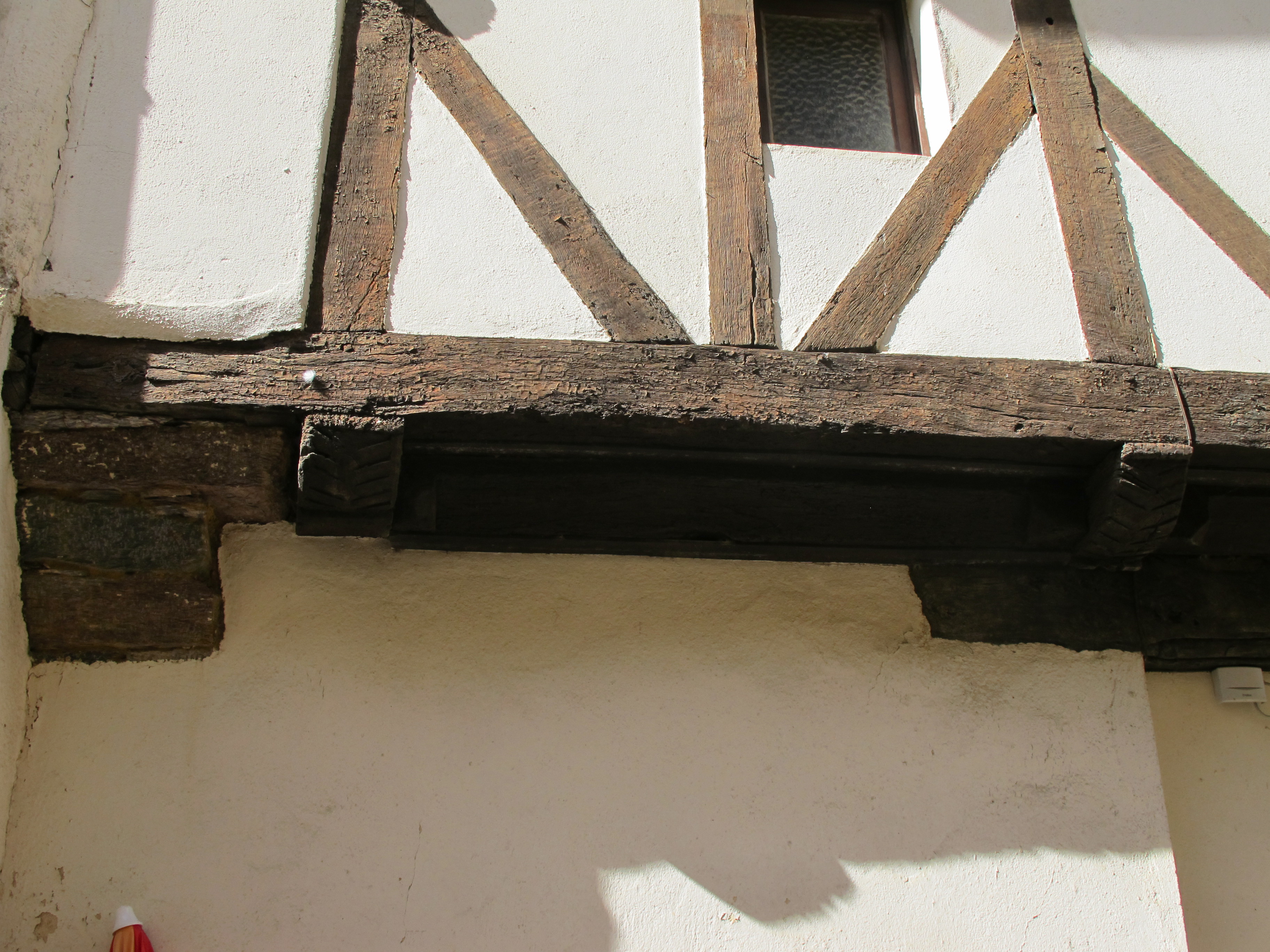 Maison, élévation est : partie inférieure du pan-de-bois (état en 2012)Immatriculation