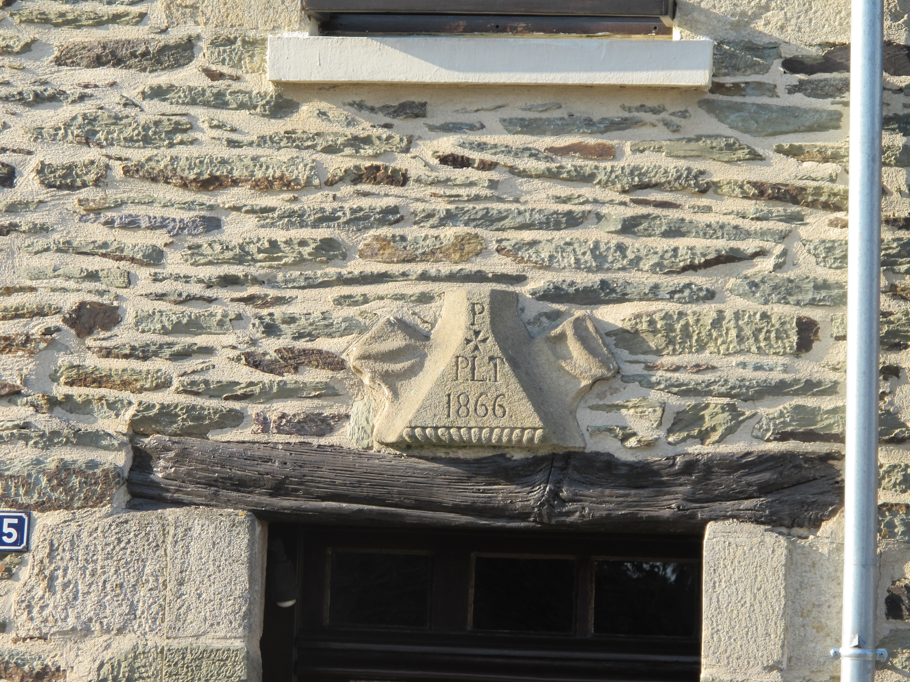 Maison, 31 faubourg de la Madeleine : pierre en remploi au-dessus du linteau de la porte, sur laquelle sont gravés la date de construction et les initiales du constructeur (état en 2012)Immatriculation