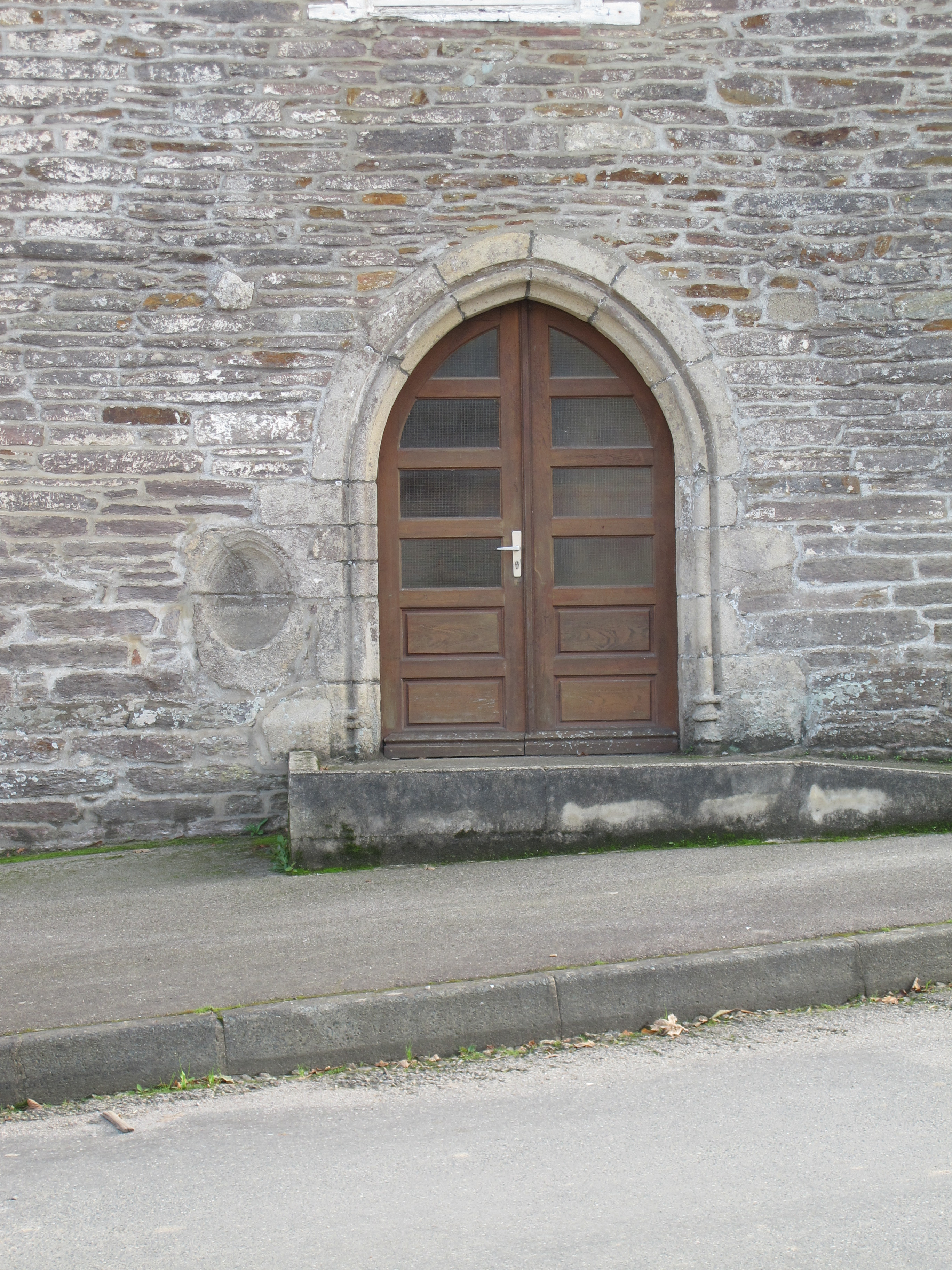 Chapelle, aujourd'hui maison ?, élévation nord : la porte du XVe siècle avec le bénitier (sur la gauche) (état en 2012)Immatriculation