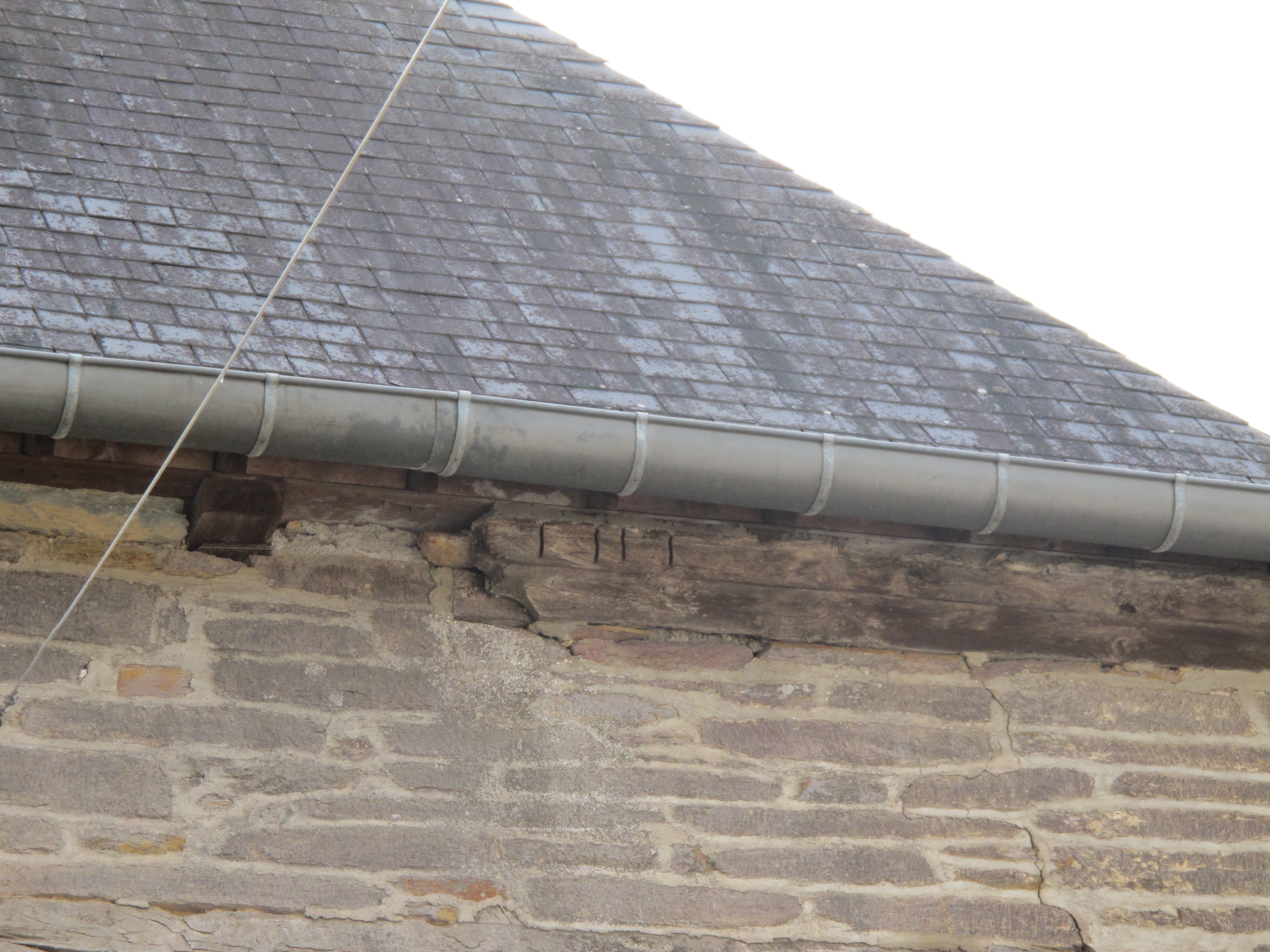 Chapelle, aujourd'hui maison ?, élévation est : la corniche en bois chanfreinée, gravée de la date 1717 ? (état en 2012)Immatriculation
