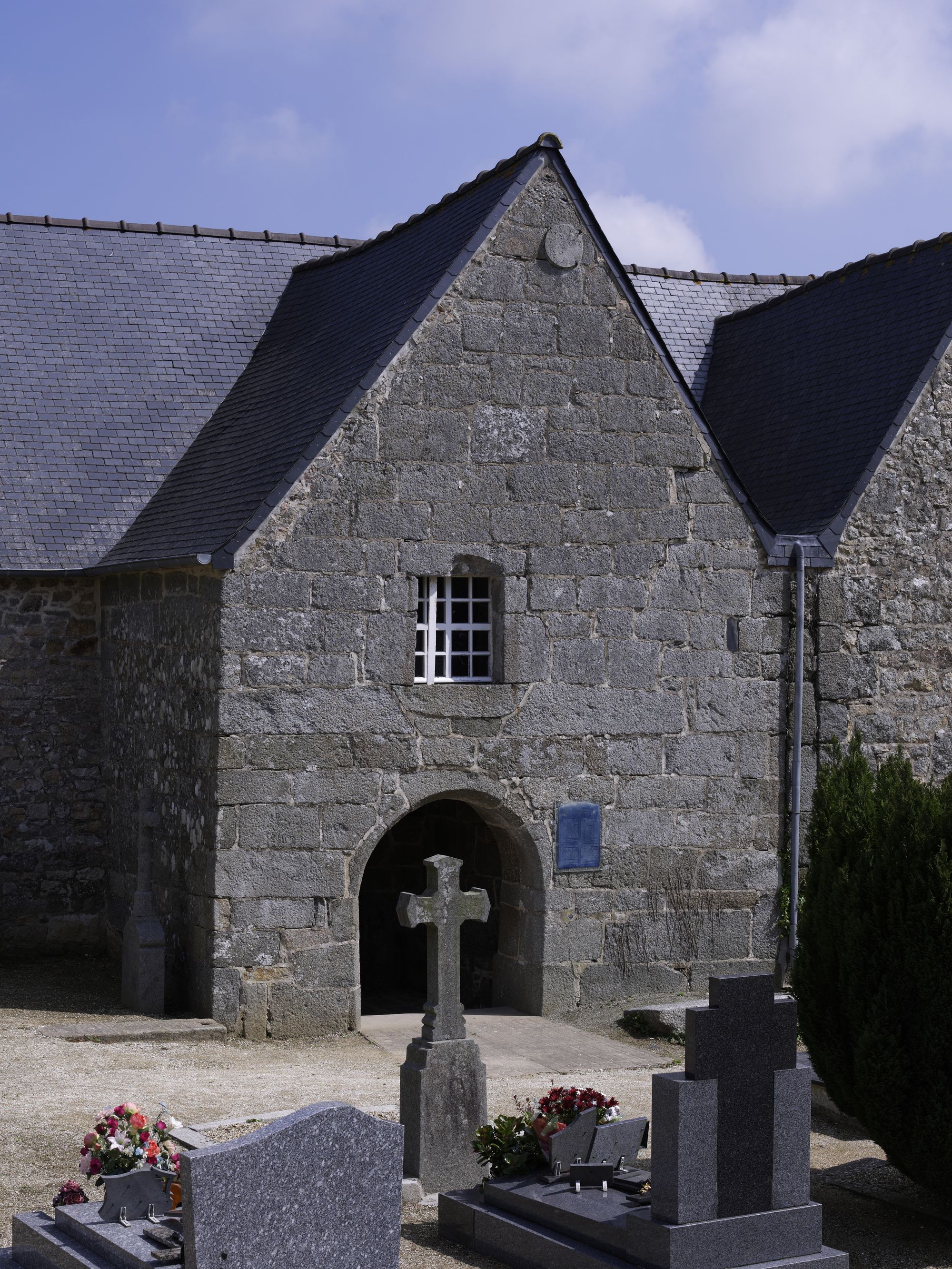 Caouënnec-Lanvézéac, bourg de Lanvézéac : église paroissiale de Saint-Ezéchiel, porche sud surmonté de la trésorerieImmatriculation