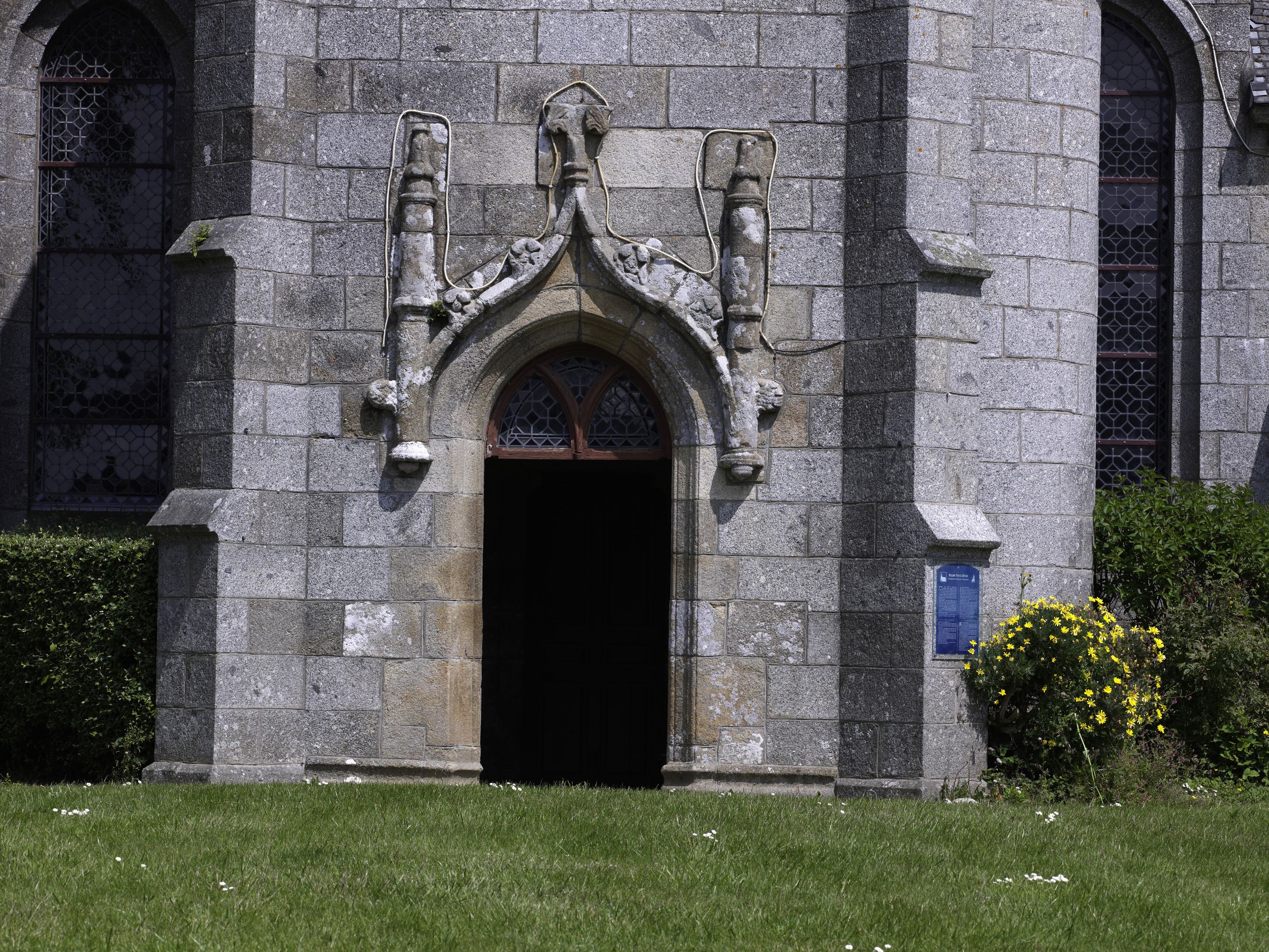 Caouënnec-Lanvézéac, bourg de Caouënnec : église paroissiale de Notre-Dame, vue de détail du porche sudImmatriculation