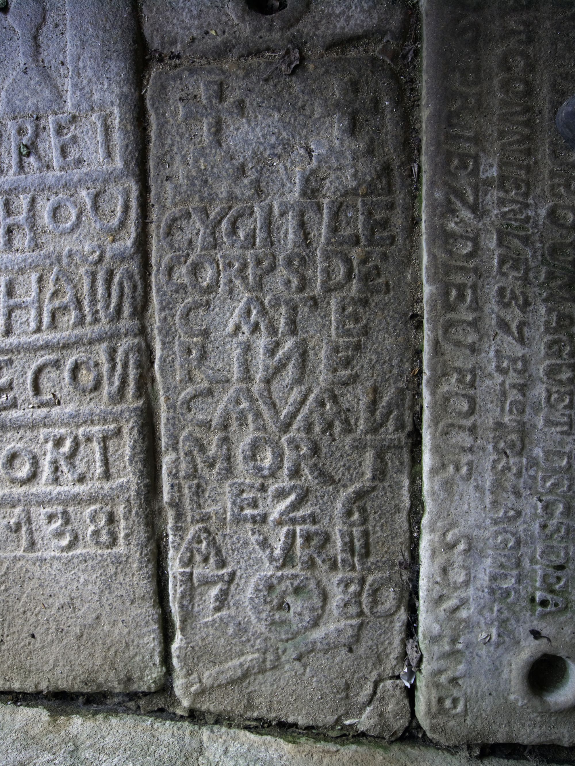Berhet, Confort : chapelle Notre-Dame de Confort, porche sud, pierre tombale de 1780. Elle a été remployée comme pavement de porcheImmatriculation