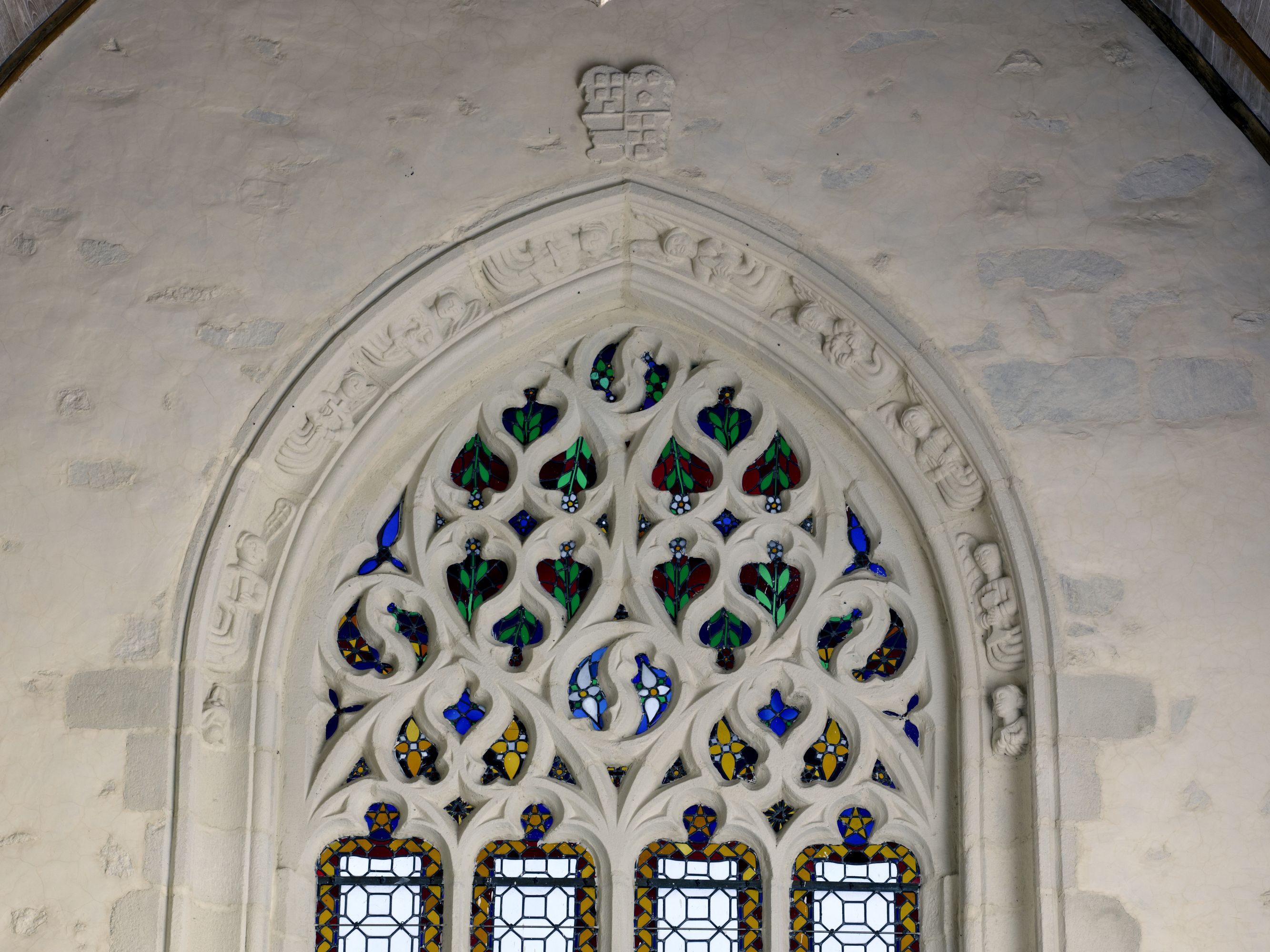 Berhet, Confort : chapelle Notre-Dame de Confort, fenestrage est, vue de détail du décorImmatriculation