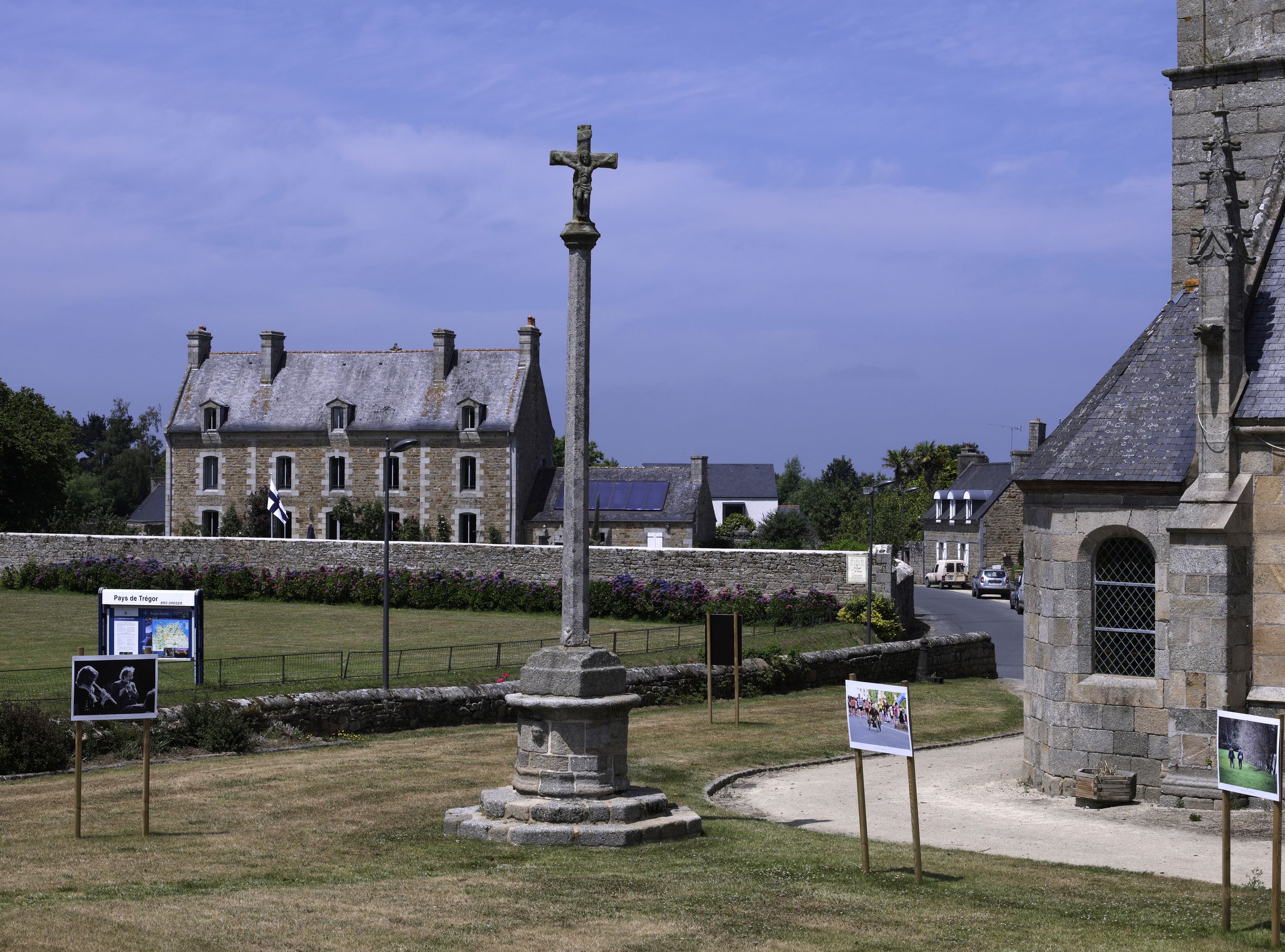Tonquédec, le bourg, place de l'église : croix monumentale, vue générale, Christ en croix. En arrière plan : l'ancien presbytèreImmatriculation