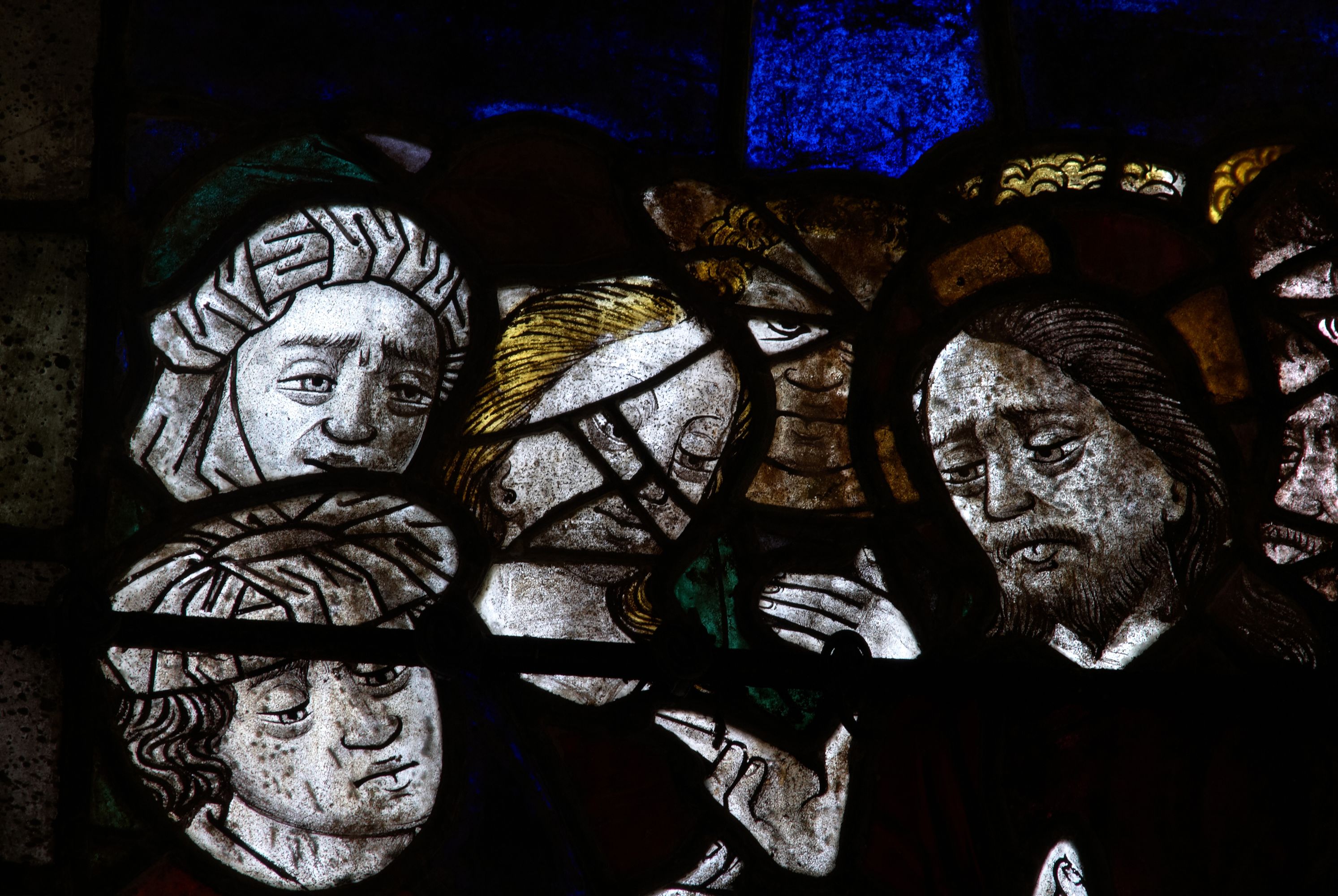 Tonquédec, le bourg : église paroissiale Saint-Pierre, vue intérieure, détail des vitrauxImmatriculation