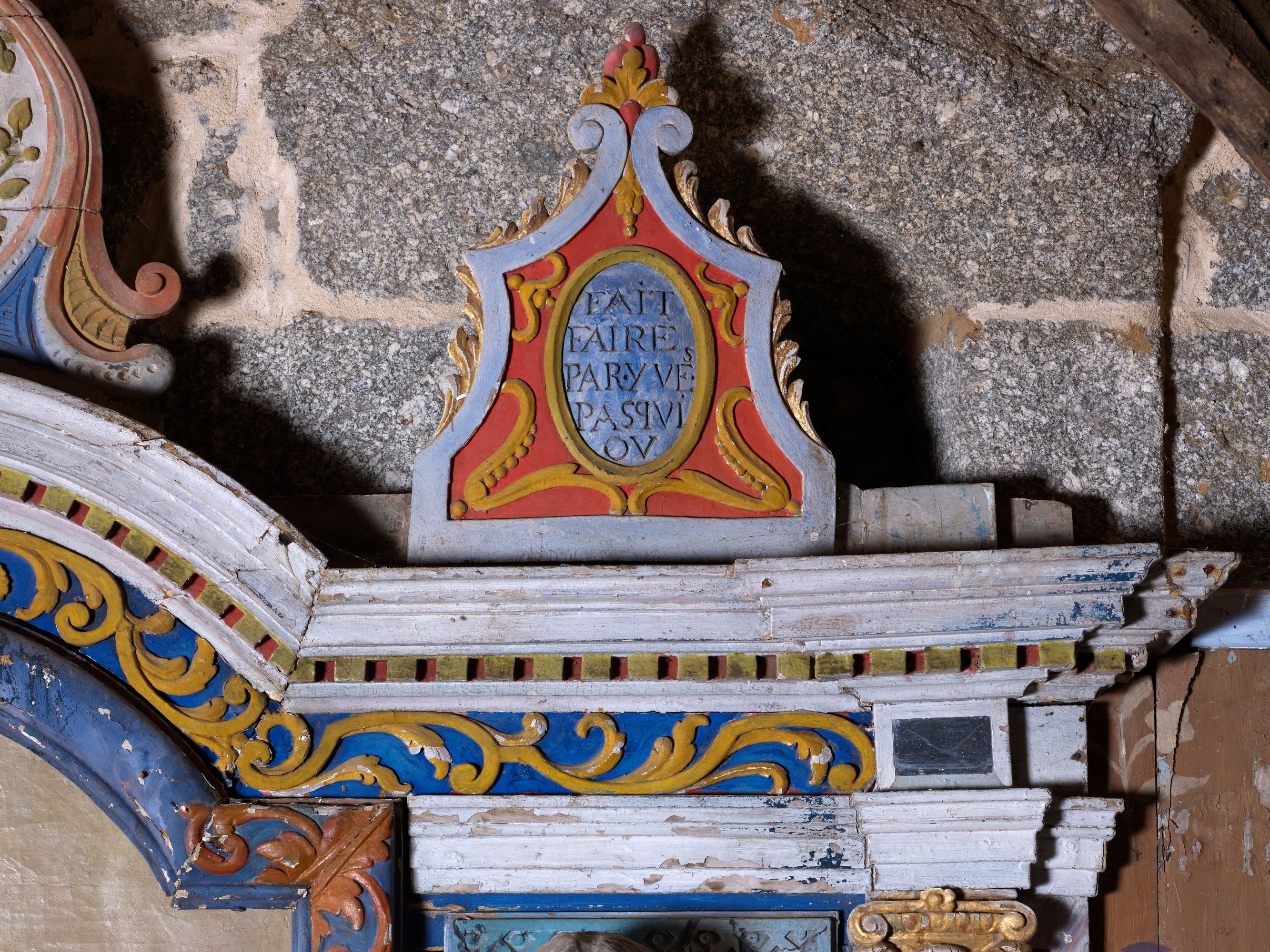 Tonquédec, le Loc : chapelle, vue intérieure, retable, vue de détail. On peut lire l'inscription suivante : "FAIT / FAIRE / PAR . YVEs / PASQUI/OU"Immatriculation