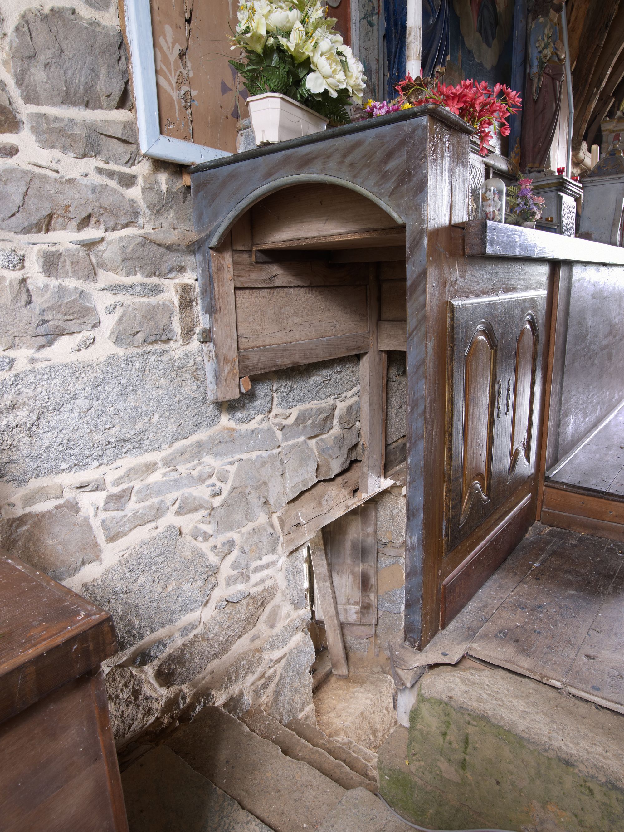 Tonquédec, le Loc : chapelle, vue intérieure, marches de l'escalier menant à la pièce en sous-solImmatriculation