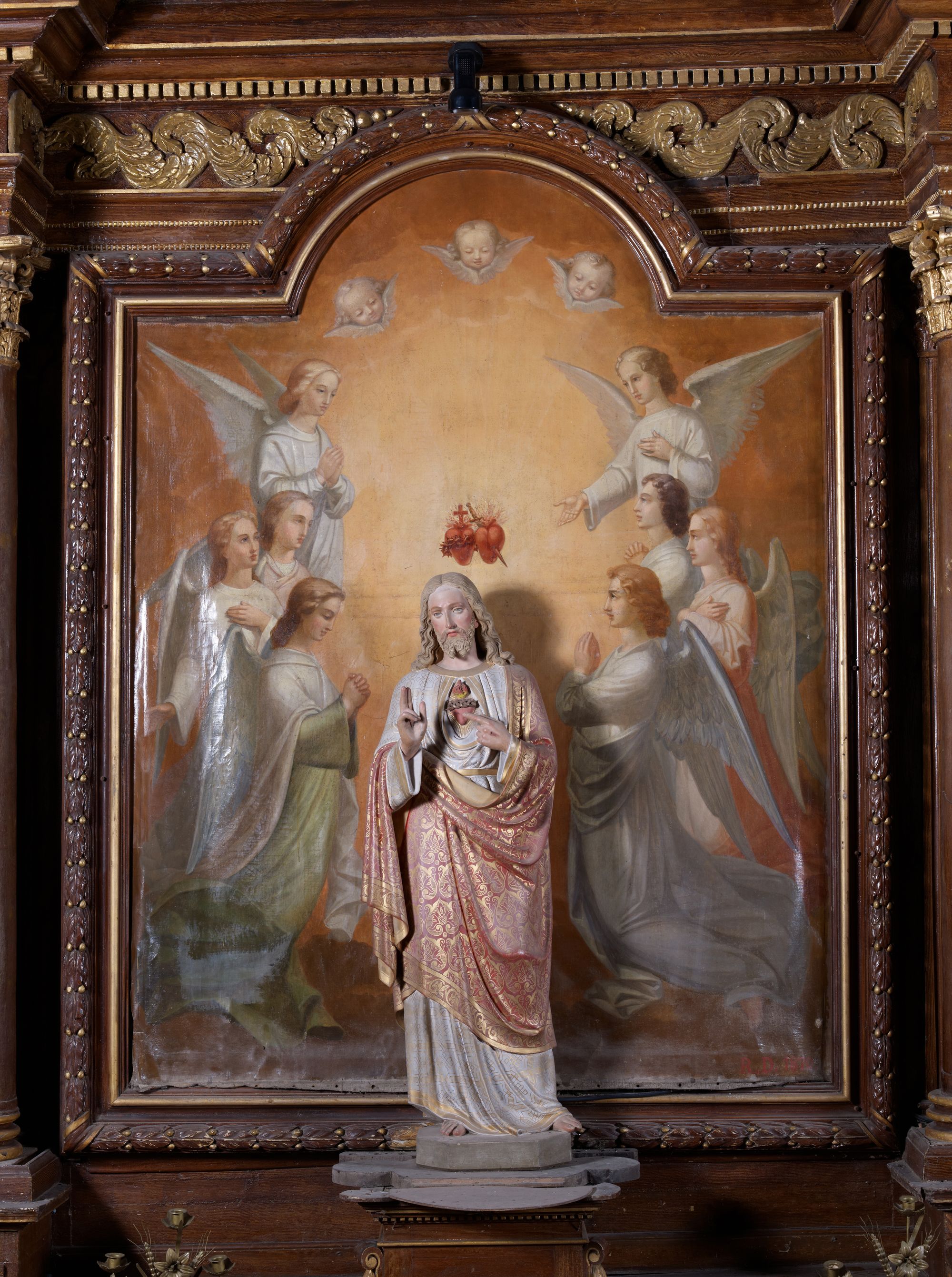 Langoat, le bourg : église paroissiale Sainte-Pompée, autel du transept nord, tableau. Il porte l'inscription et le millésime suivant : "R. D. 1870"Immatriculation