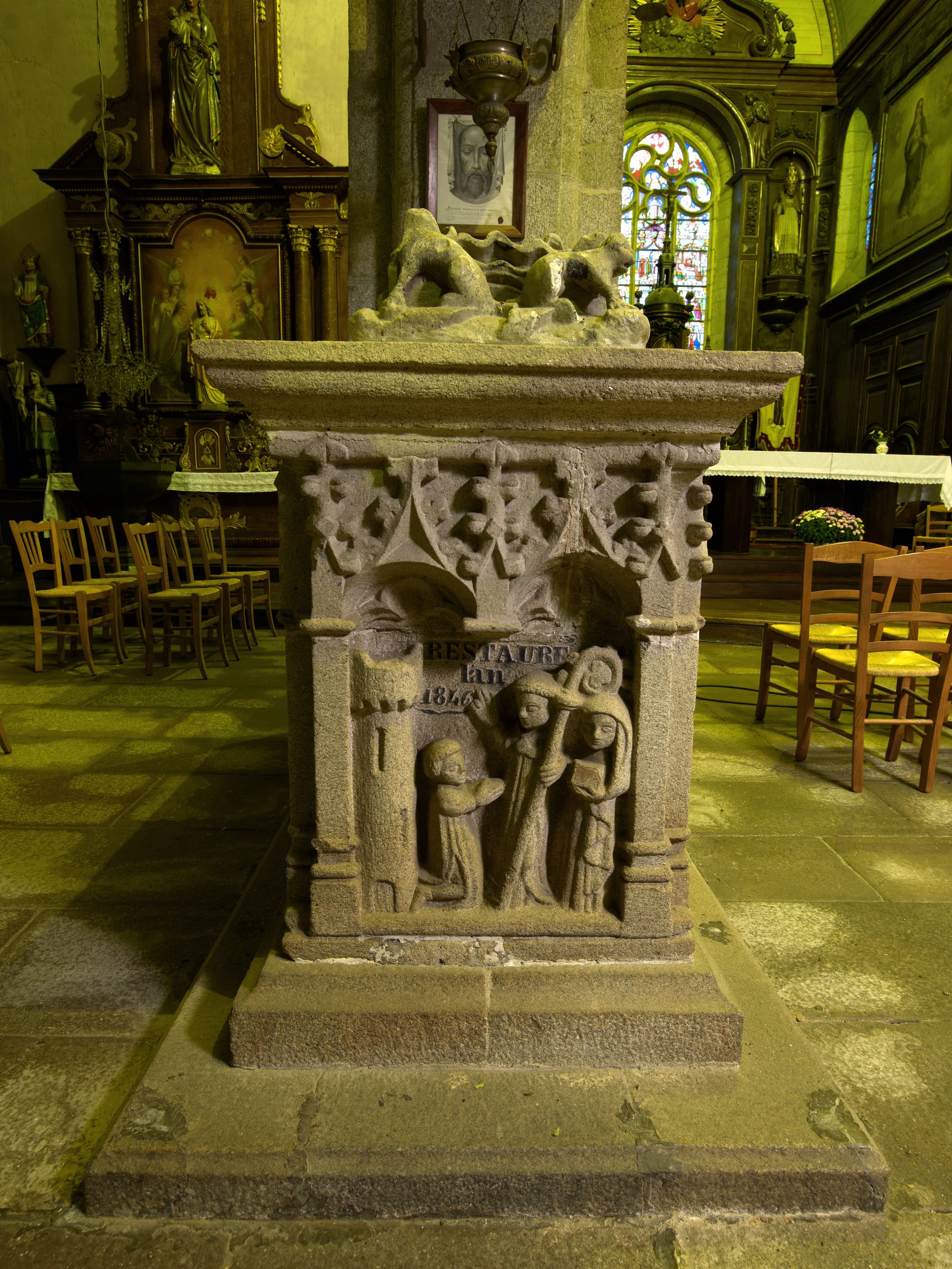 Langoat, le bourg : église paroissiale Sainte-Pompée, tombeau à gisant de Sainte-Pompée, face ouest. Elle porte l'inscription : "RESTAURE l'an 1846"Immatriculation