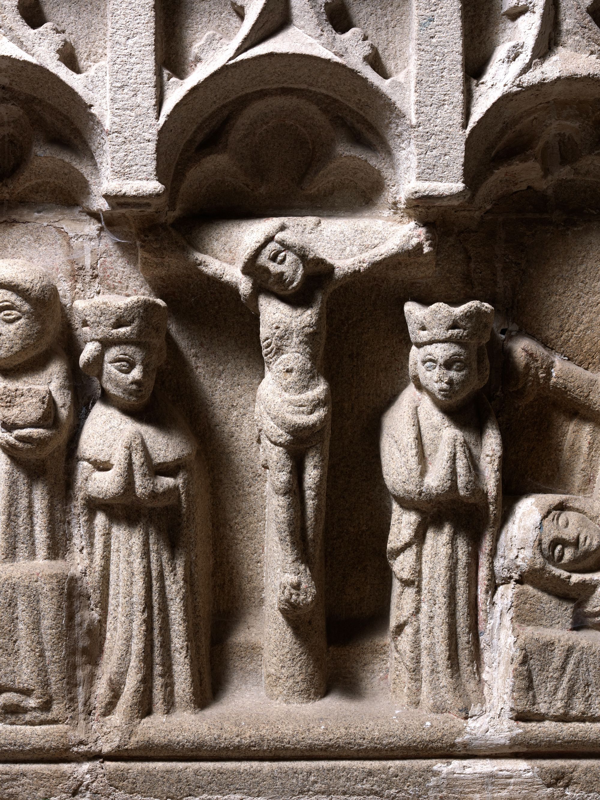 Langoat, le bourg : église paroissiale Sainte-Pompée, tombeau à gisant de Sainte-Pompée, face sud, vue de détailImmatriculation