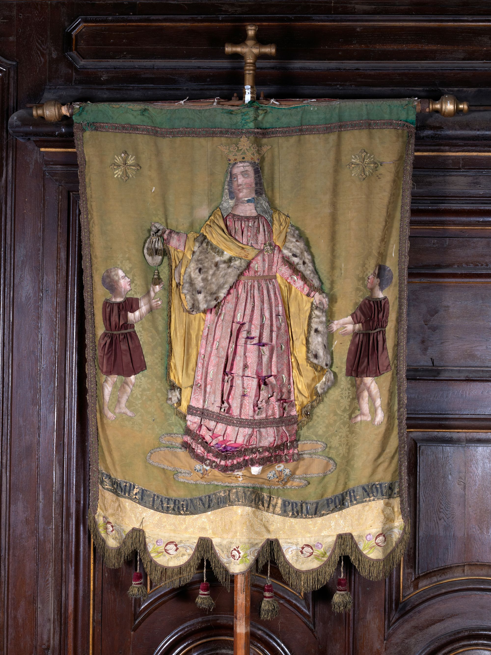 Langoat, le bourg : église paroissiale Sainte-Pompée, bannière dédiée à Sainte-Pompée. Elle porte l'inscription suivante : "Sainte-Pompée, patronne de Langoat, priez pour nous"Immatriculation