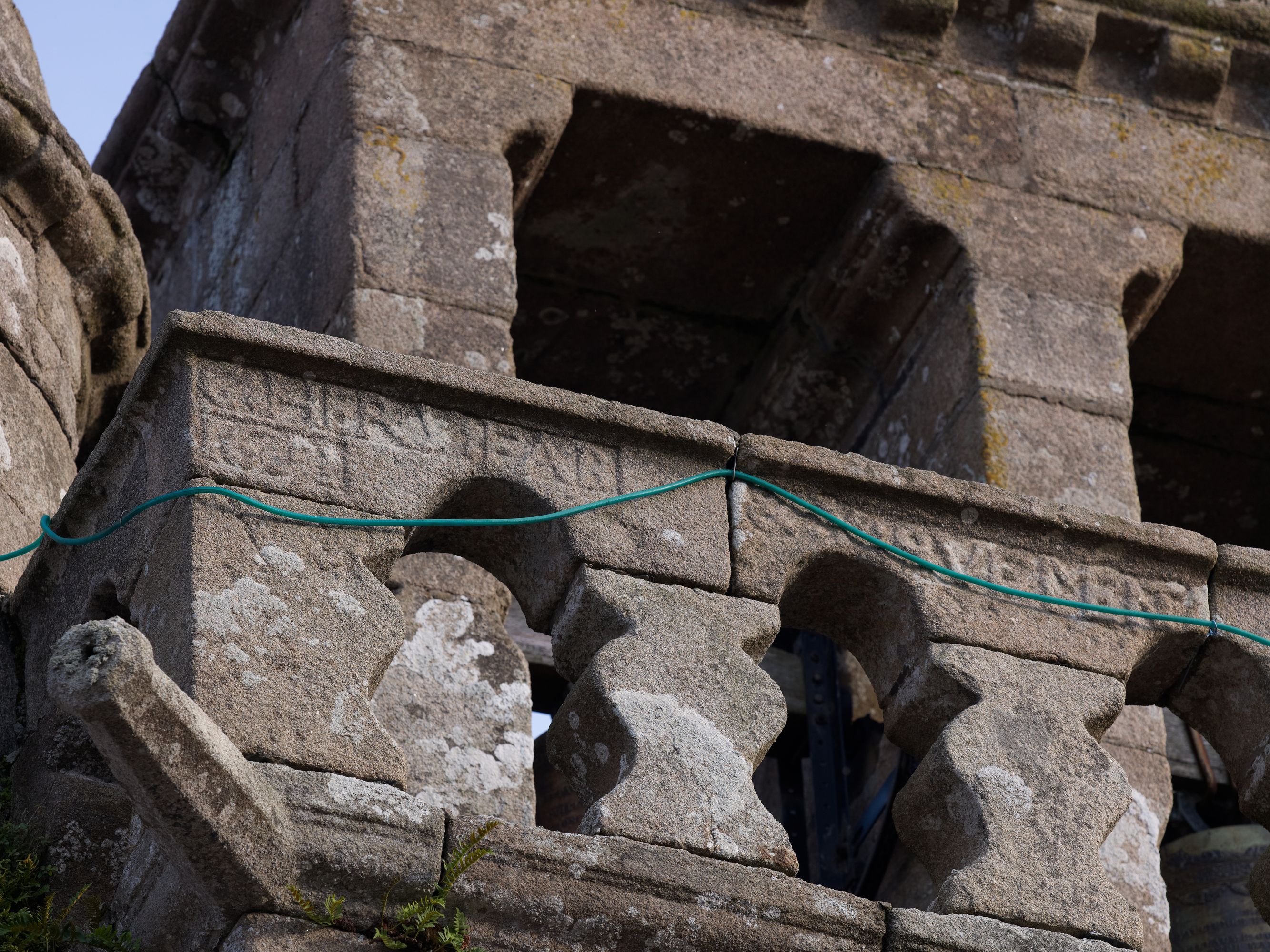 Balustrade de la chambre des cloches. Détail de l'inscriptionImmatriculation