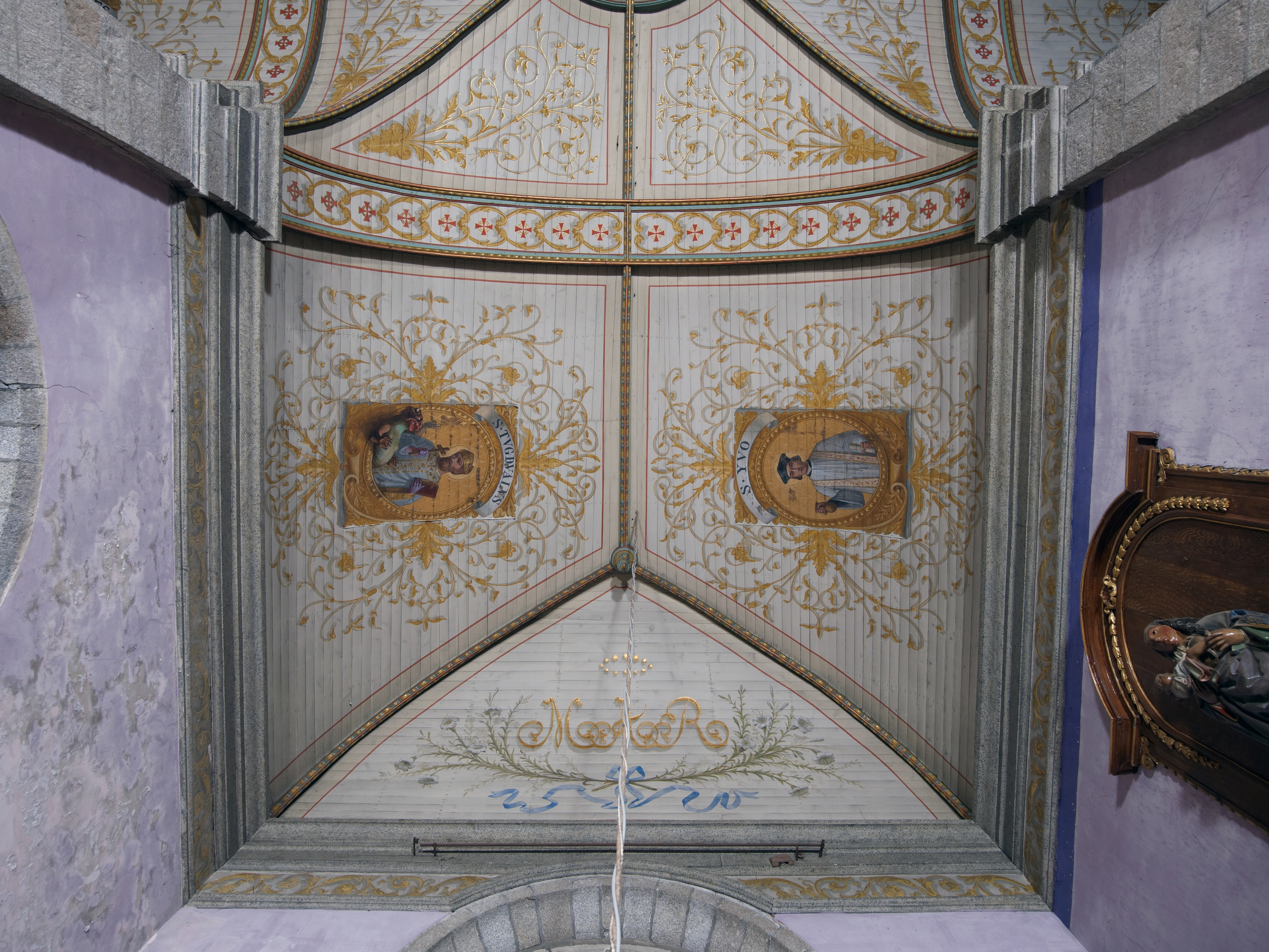 Langoat, le bourg : église paroissiale Sainte-Pompée, voûte lambrissée. Les toiles peintes sont clouées sur le lambrisImmatriculation