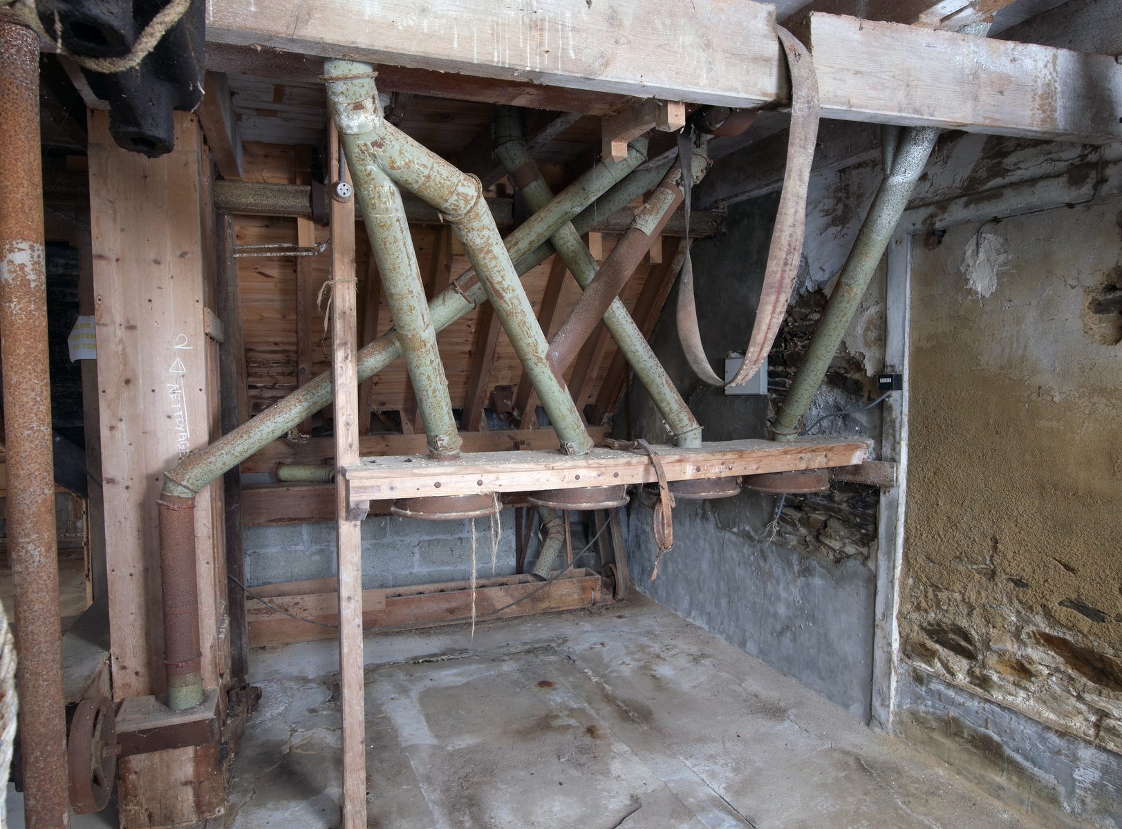 Corps central du moulin. Rez-de-chaussée. Salle ouest. Installation pour l'ensachage des déchets. Vue généraleImmatriculation