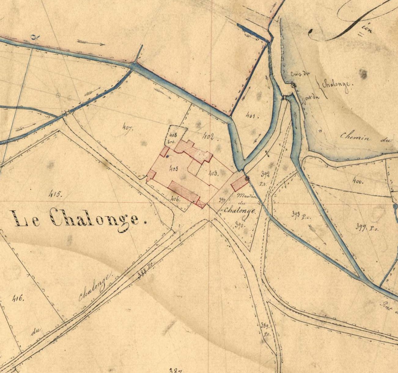 Extrait du cadastre de 1843, château et moulin du ChalongeImmatriculation