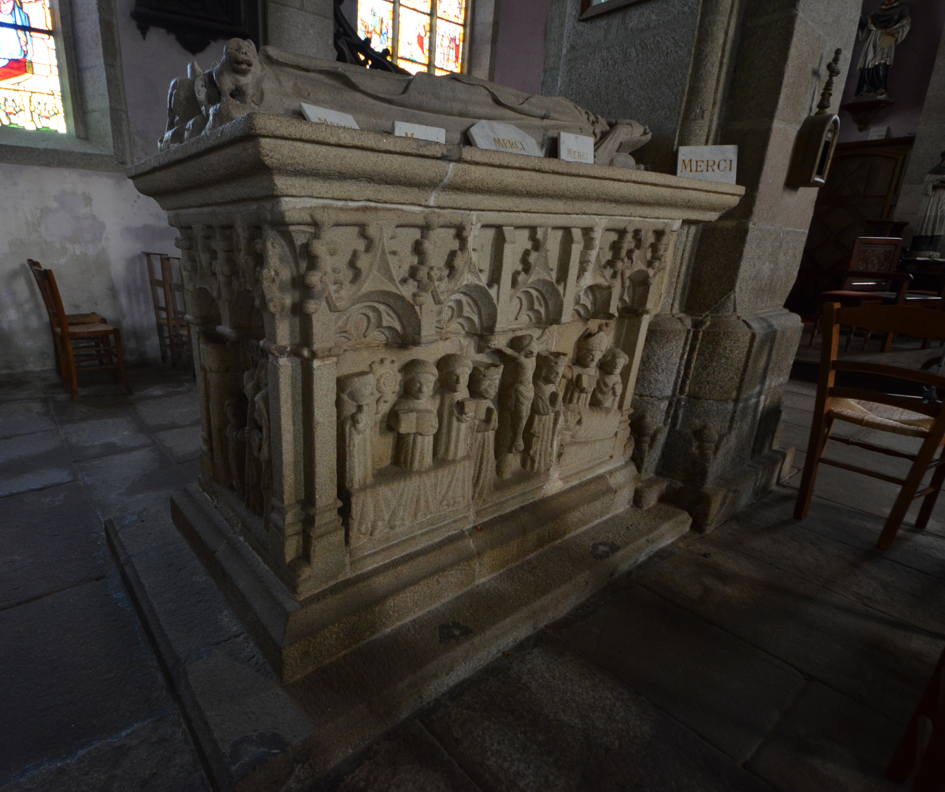 Langoat, le bourg : église paroissiale Sainte-Pompée, tombeau à gisant de Sainte-Pompée, face sudImmatriculation