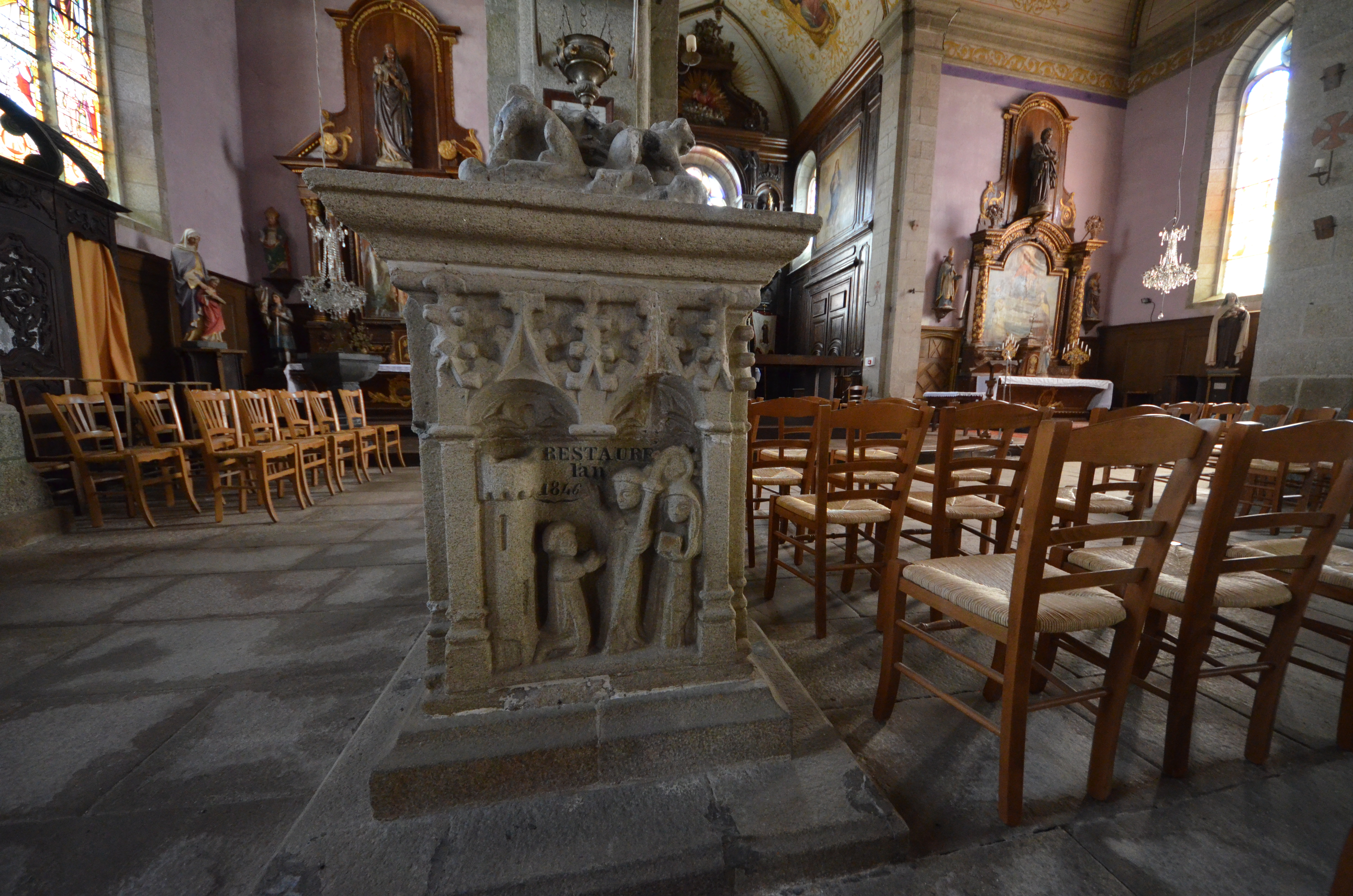 Langoat, le bourg : église paroissiale Sainte-Pompée, tombeau à gisant de Sainte-Pompée, face ouest. Elle porte l'inscription : "RESTAURE l'an 1846"Immatriculation