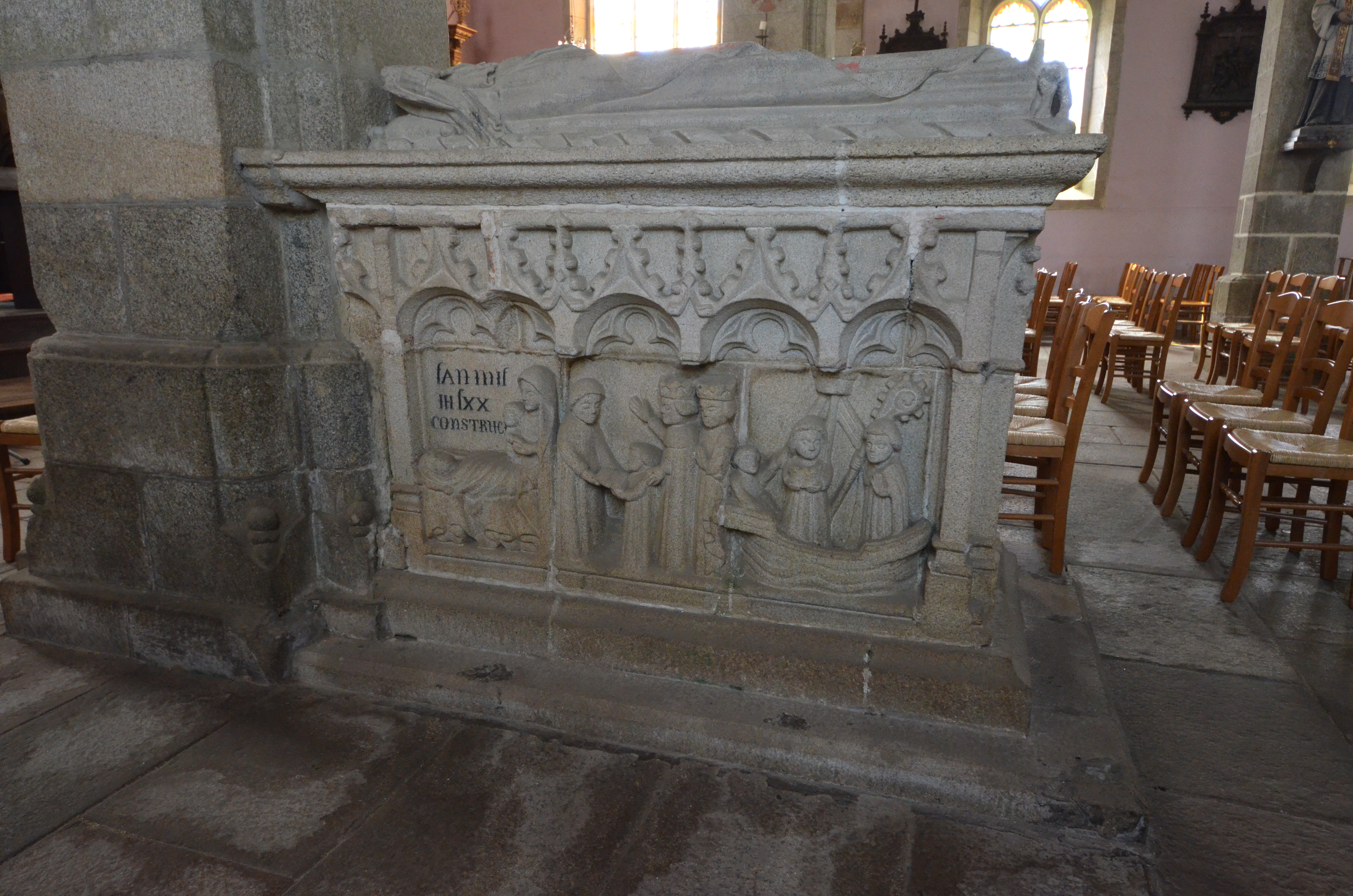 Langoat, le bourg : église paroissiale Sainte-Pompée, tombeau à gisant de Sainte-Pompée, face nord. Elle porte l'inscription : "lAN MIL III lXX [1370] CONSTRUCE"Immatriculation