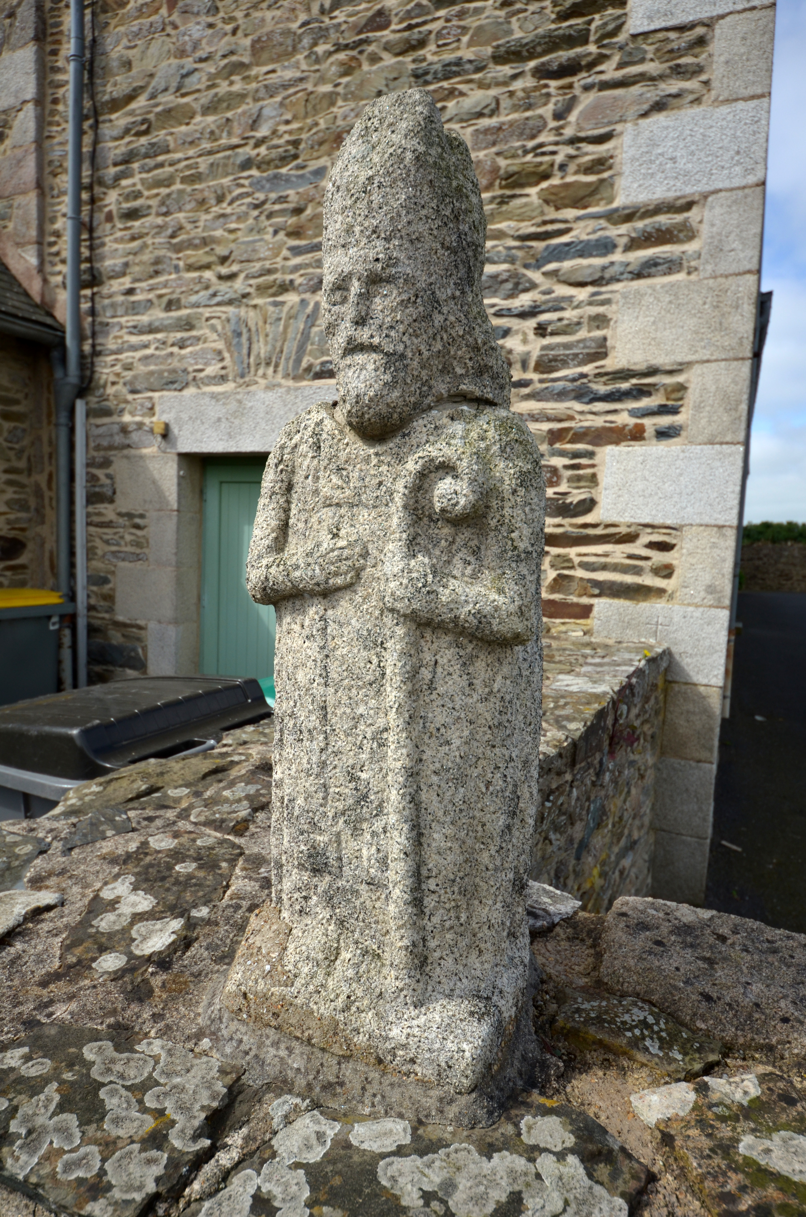 Langoat, le bourg : presbytère, pignon est, statue d'évêque en graniteImmatriculation