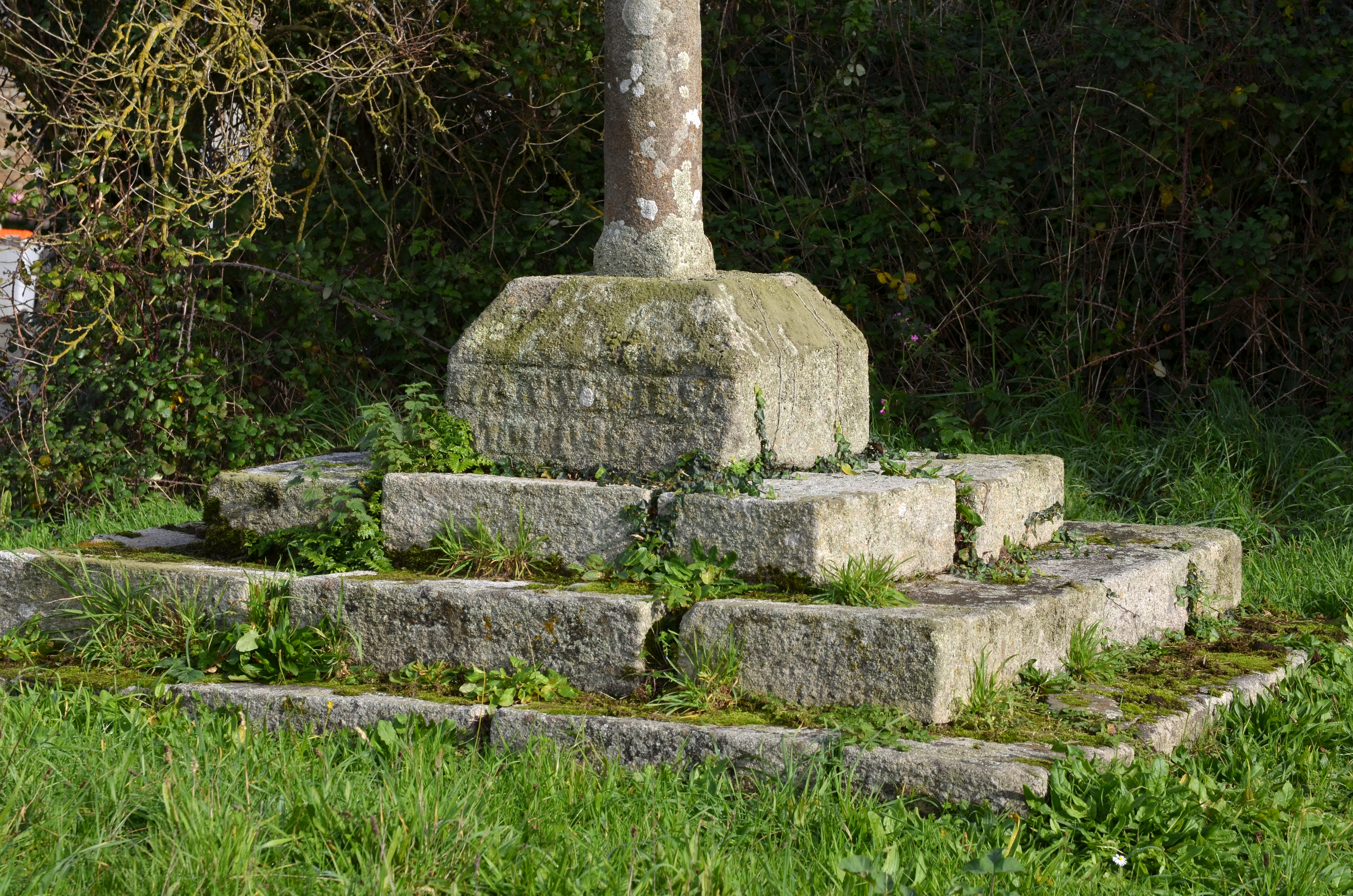Langoat, Saint-Pierre : croix de chemin de Coat Croas (Koad Kroaz), détail du socleImmatriculation