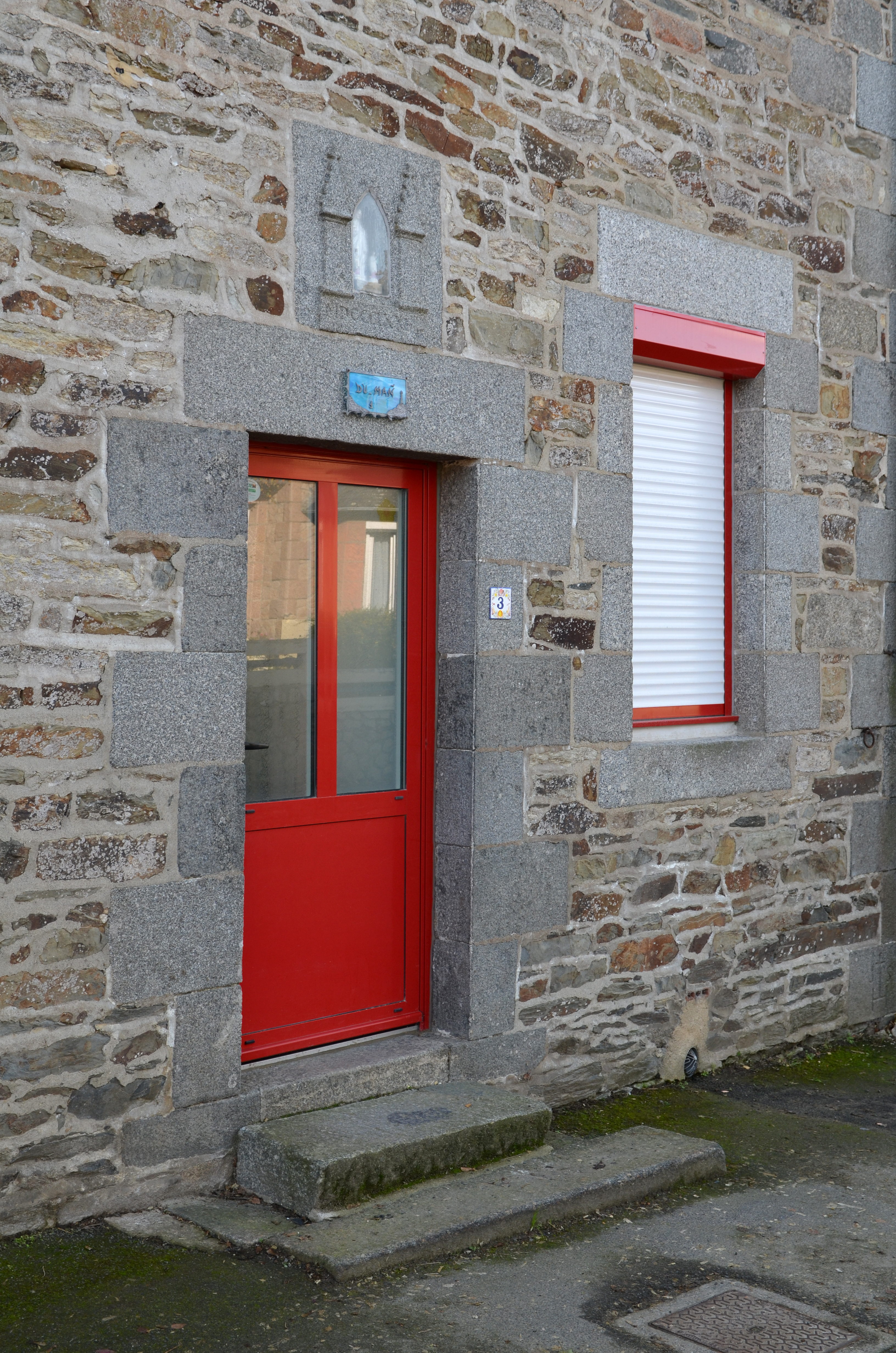 Langoat, le bourg (nord-ouest), rue Sainte-Pompée : maison ornée d'une niche à statue et datée par millésime de 1871 (chiffres romains : MDCCCLXXI). Cette mise en oeuvre fait penser à la niche du logis de ferme de Kermeur (1869 / MDCCCLXIX)Immatriculation