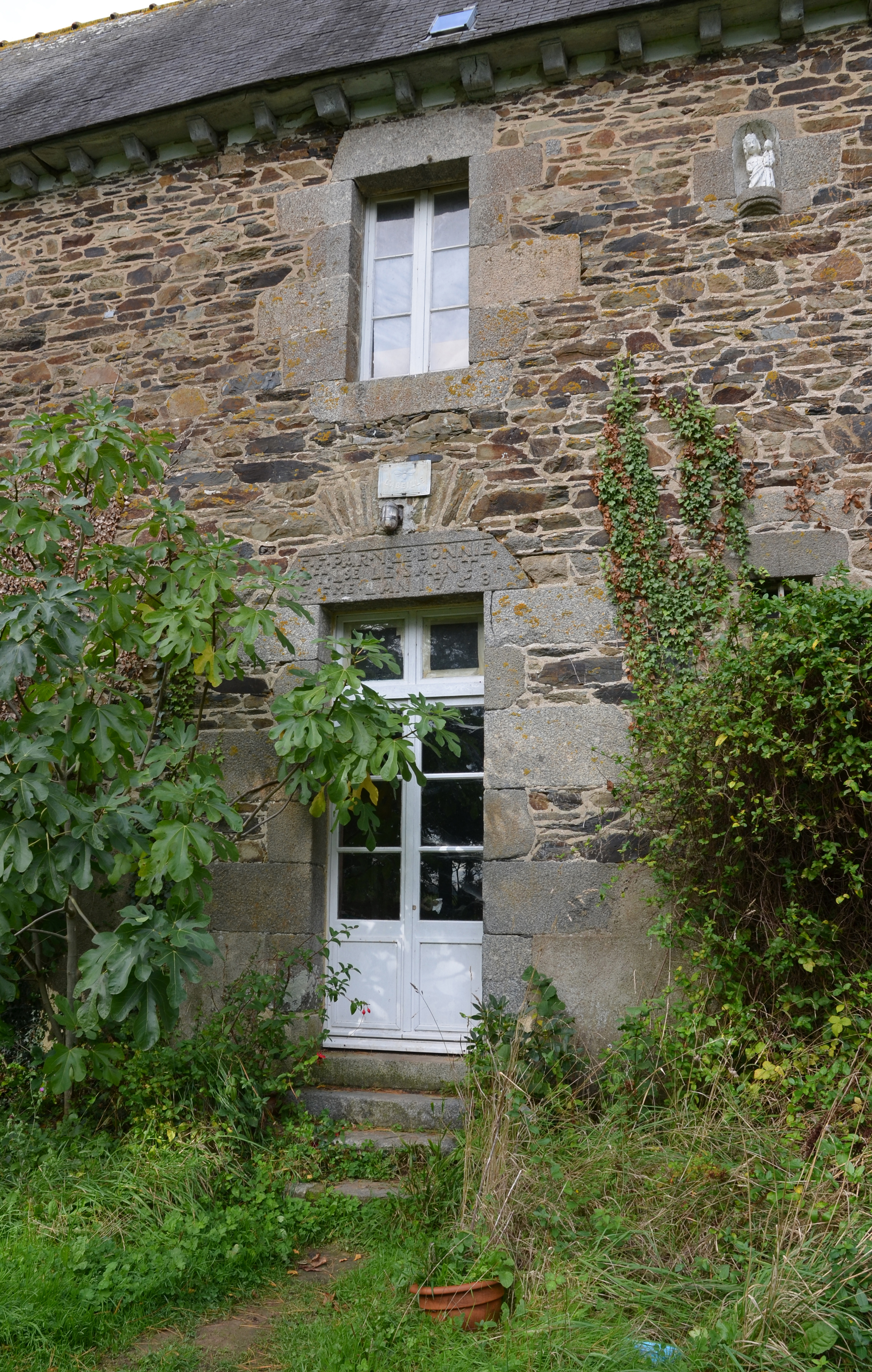 Langoat, Kermouster : manoir puis ferme, élévation orientée vers le sud-sud-est, travée centrale, porteImmatriculation