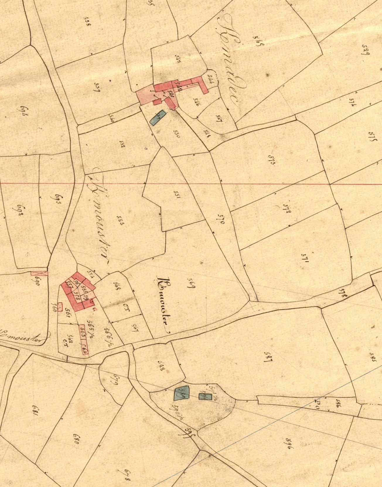 Extrait du cadastre ancien de la commune de Langoat, 1836 : Kermouster et Kermadec. On note également la présence de 3 bassins (routoirs à lin ; ?)Immatriculation