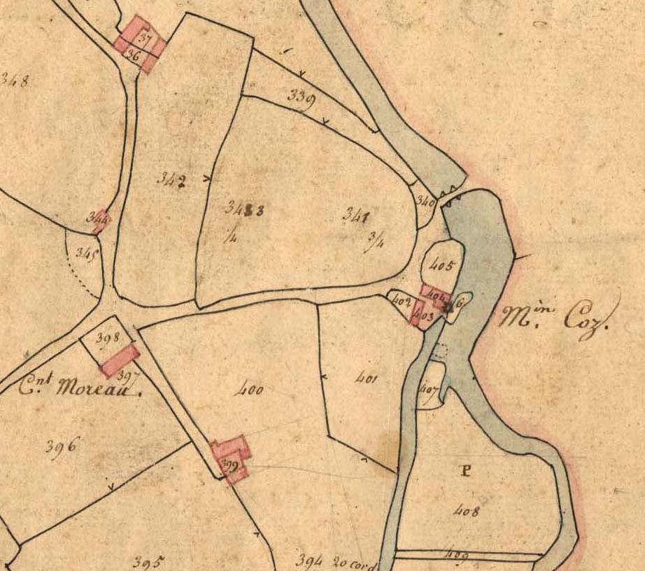 Extrait du cadastre ancien de la commune de Langoat, 1836 : Convenant Moreau, Moulin CozImmatriculation
