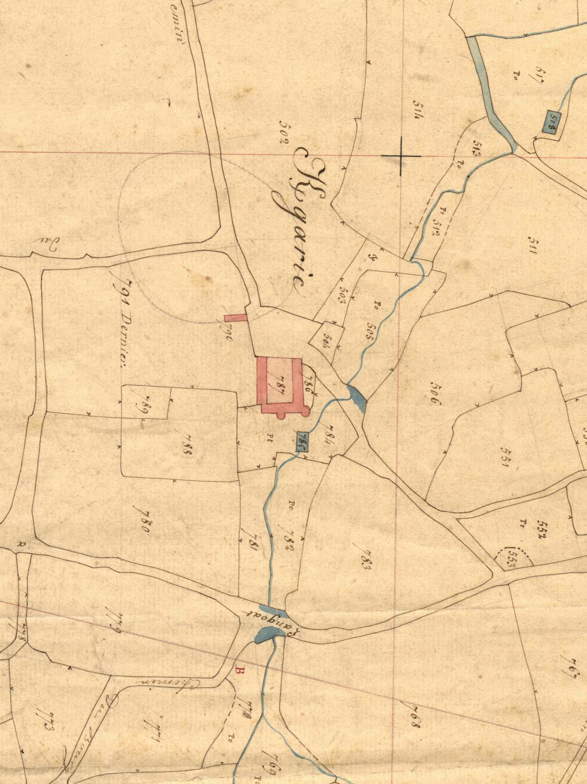 Extrait du cadastre ancien de la commune de Langoat, 1836 : Kergraric. On note la présence d'un réseau hydrographique très dense à proximitéImmatriculation