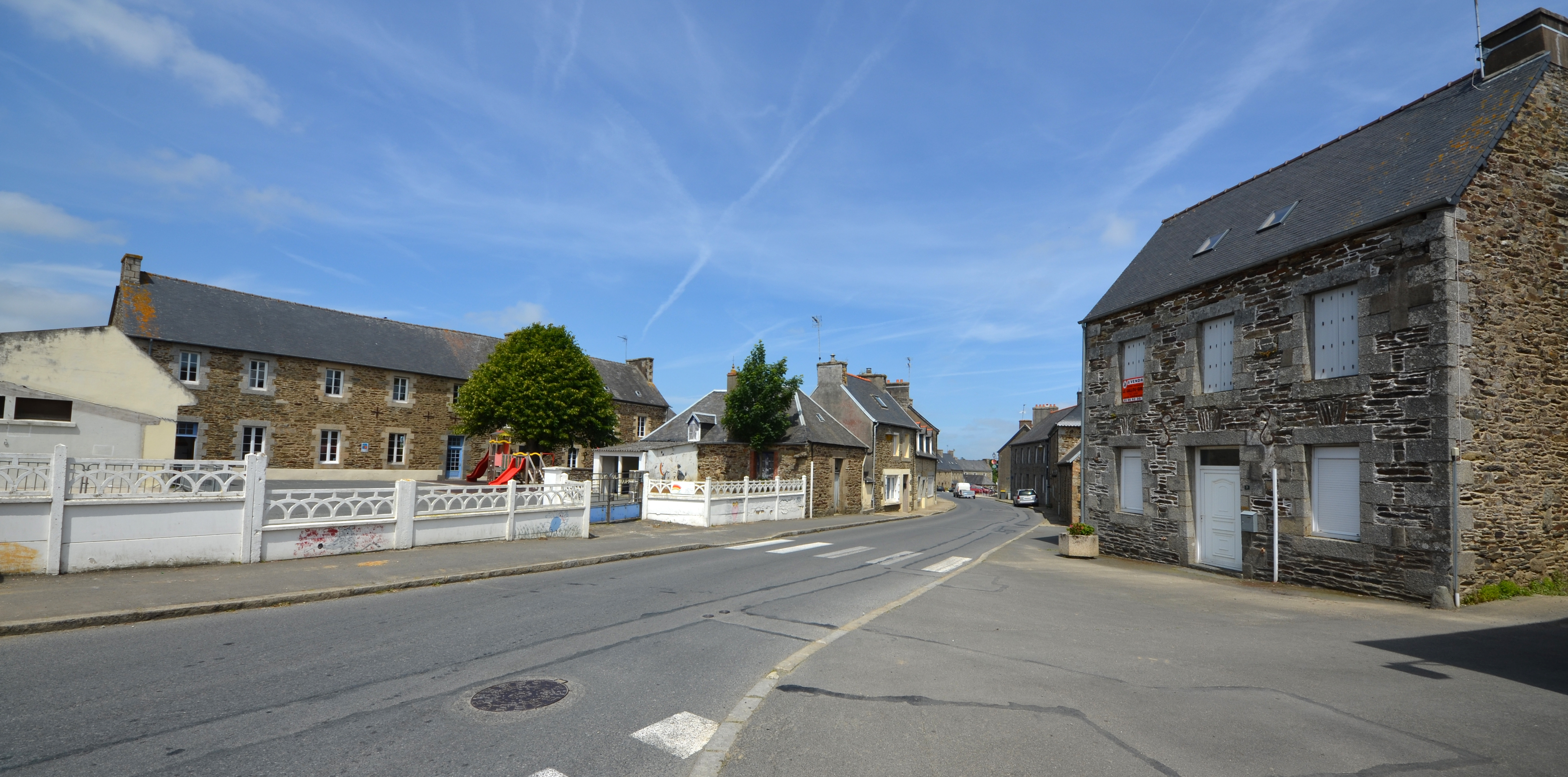 Langoat, le bourg (ouest) : débouché ouest de la rue des Ecoles. Au nord, l'école privée Sainte-Pompée. Au sud, l'actelle maison à vendre a été au début du 20e siècle le "Café-tabac Connan"Immatriculation