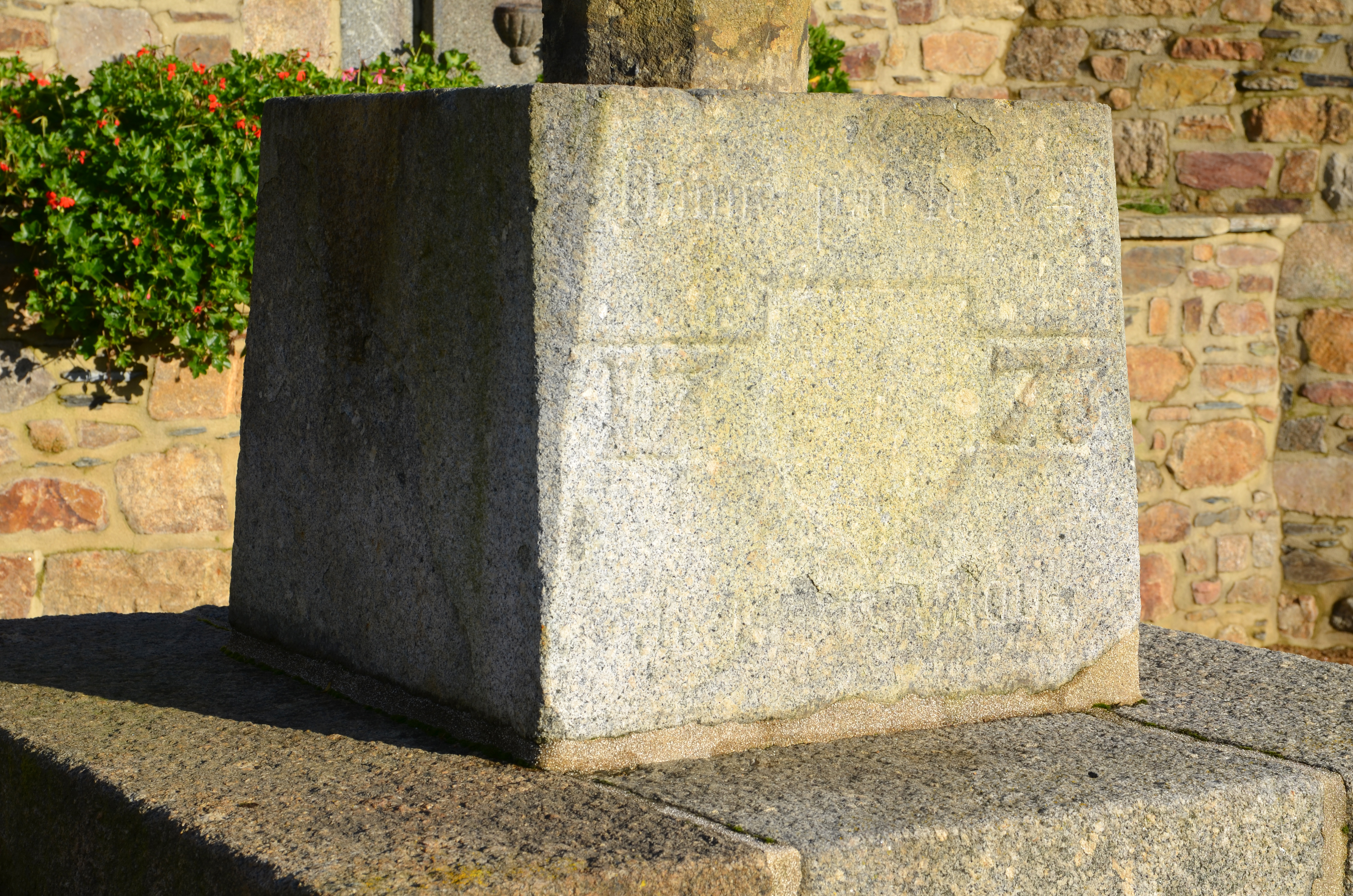 Mantallot, au nord du Bourg : croix de chemin datée par millésime de 1773, détail du socle. On peut lire "Donnée par le V[icomte] de Kergariou"Immatriculation