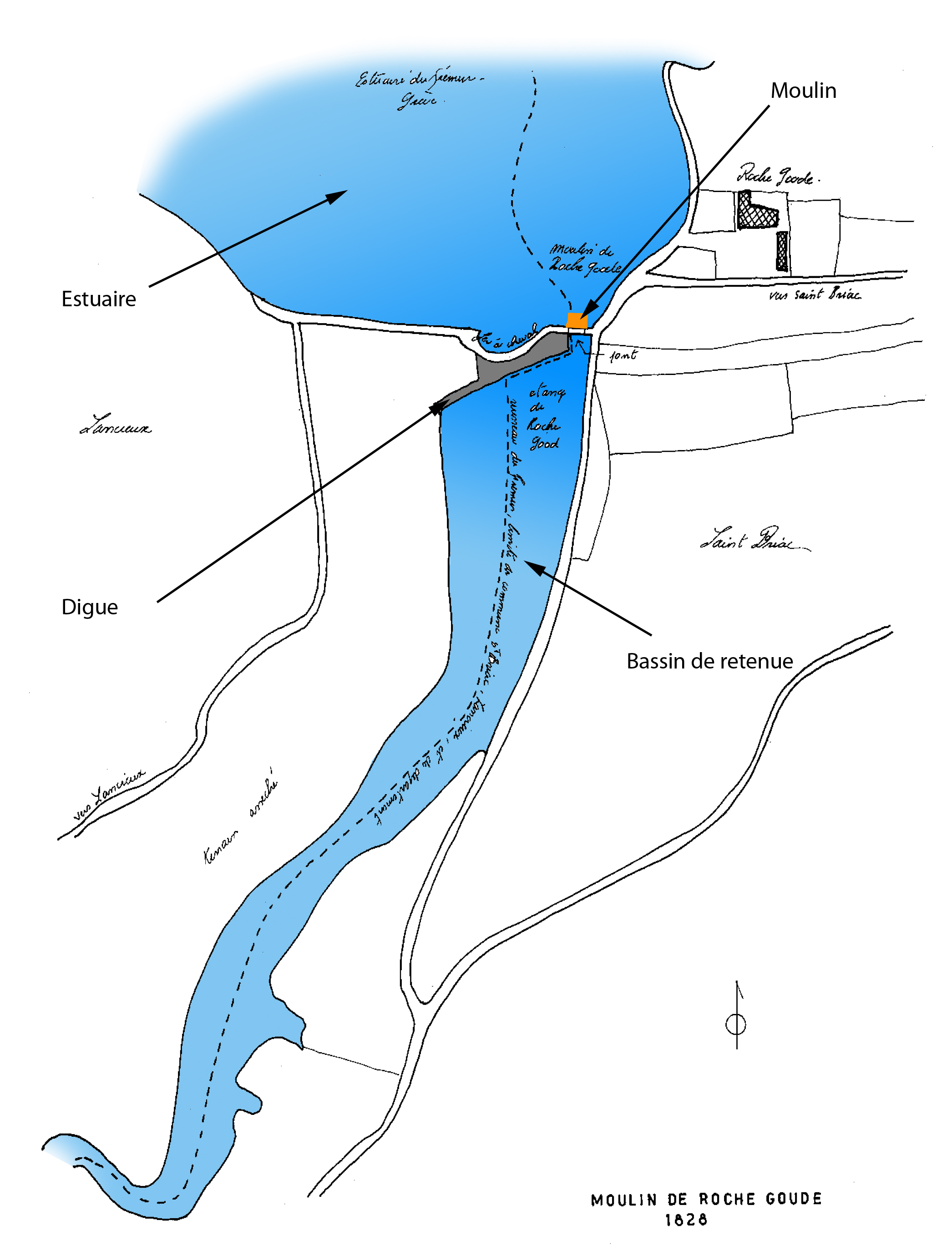 Plan de principe des moulins à marée, sur l'exemple du Moulin de Rochegoude, situé à Saint-Briac.Immatriculation