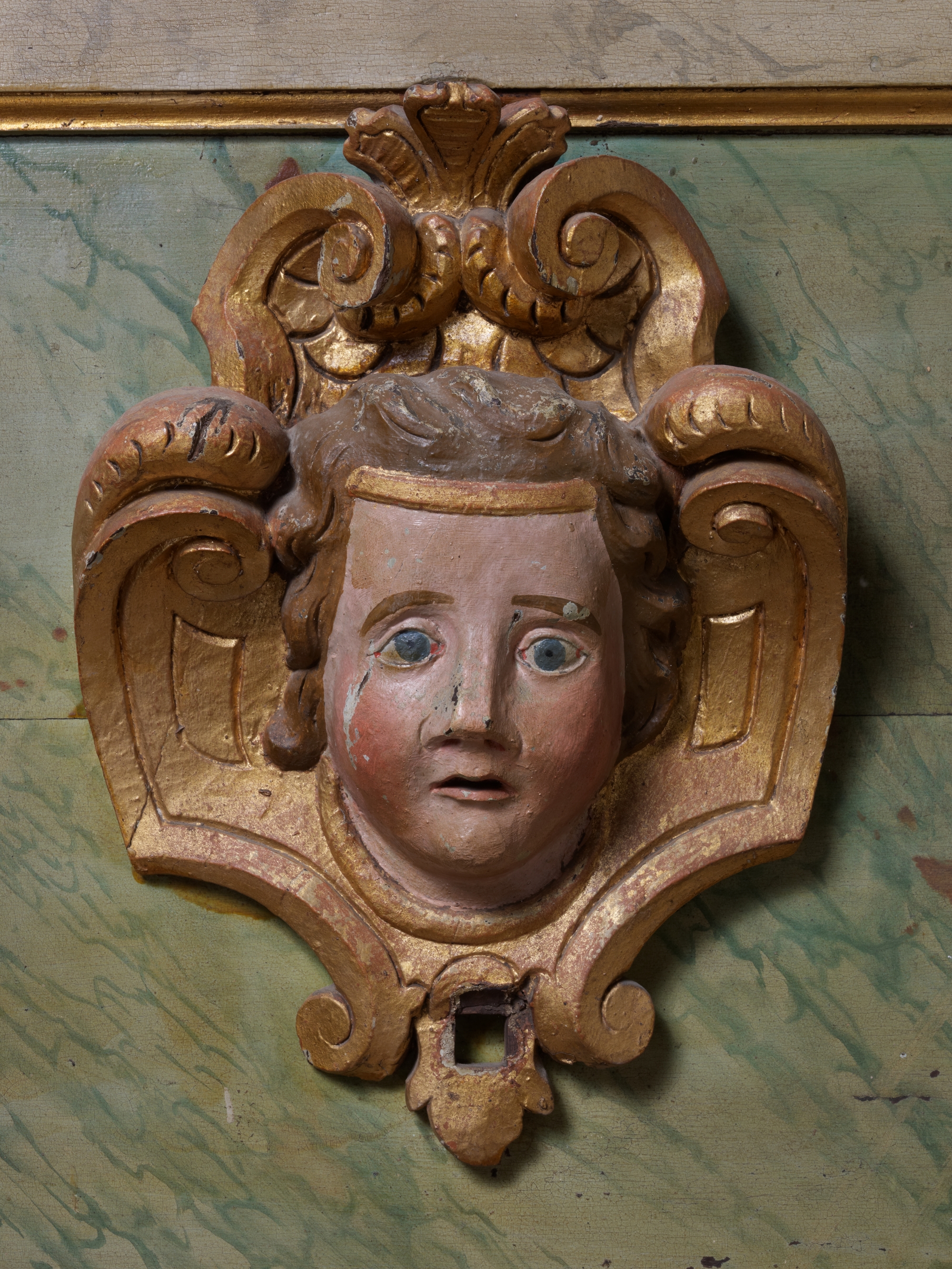 Retable : macaron placé sous la statue de saint Jean-Baptiste (état en 2013)Immatriculation