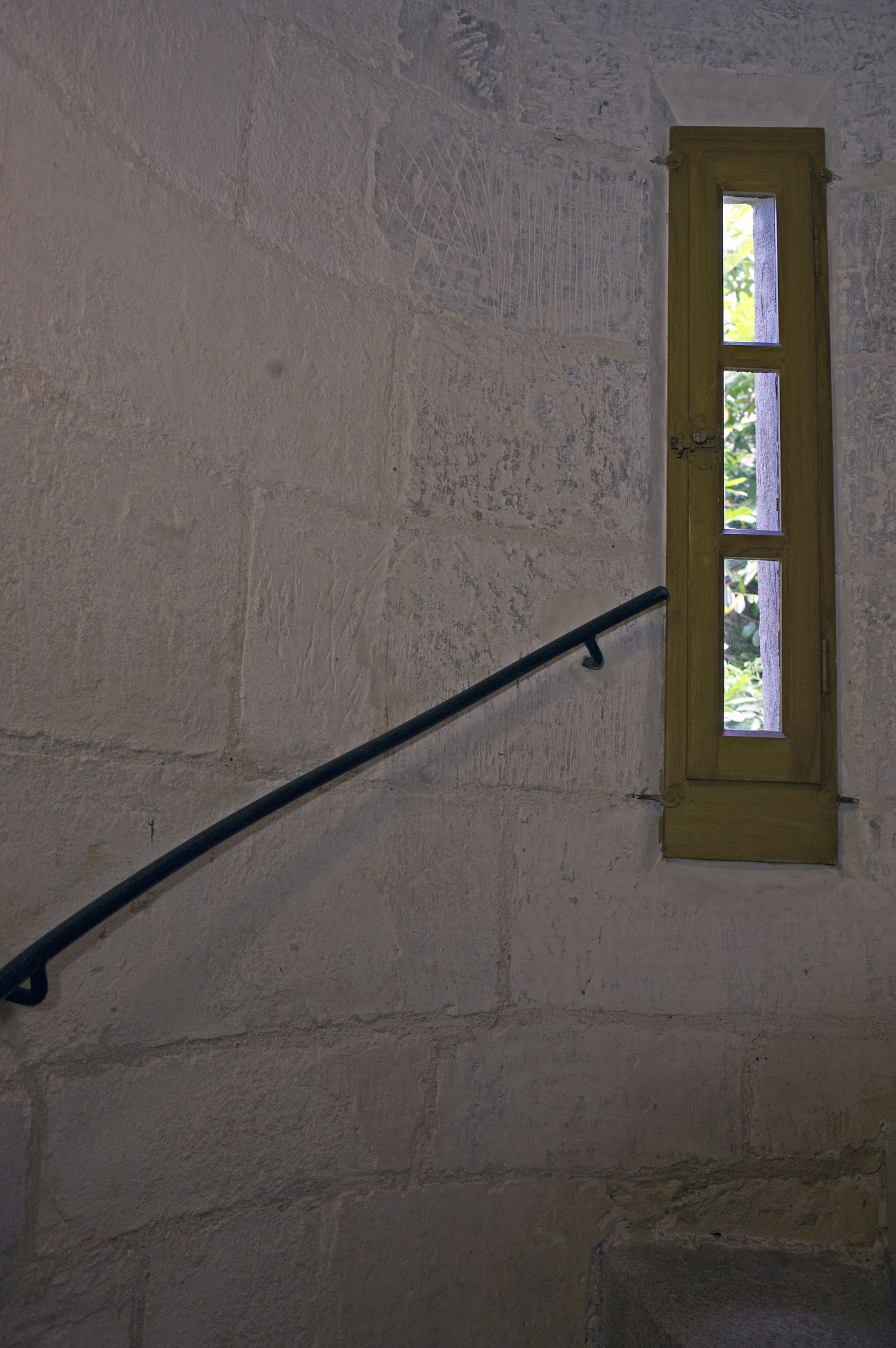 Tour d'escalier secondaire au nord, mur et fenêtre en granite entre le Rez-de-chaussée et le1er étageImmatriculation