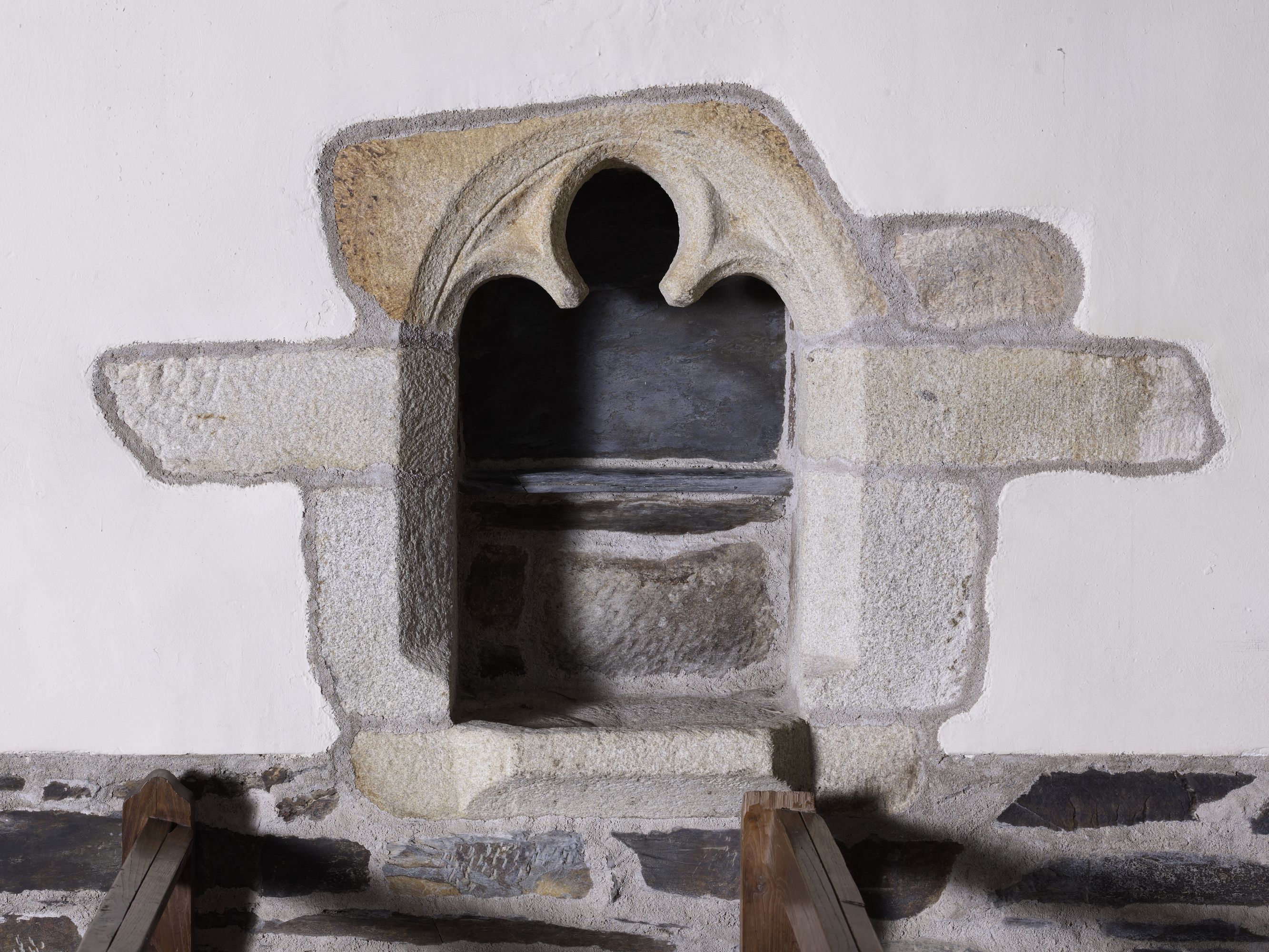 Église, nef, mur sud : lavabo-crédence trilobée (état en 2013)Immatriculation